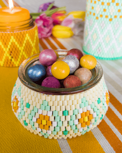 Kis tálkákat, üvegeket burkolhatunk a Hama vasalható gyöngyökkel, asztali díszítéseket készíthetünk