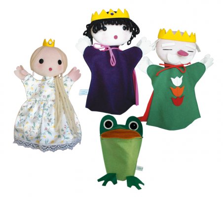 Bábkészlet felnőtt kézre, A békakirály Tartalma: 4 db kesztyűbáb, öreg király, béka, királylány, királyfi. 4 éves kortól. A kesztyűbábok Antoni Rozália iparművész által tervezett zsűrizett iparművészeti alkotások. Magyarországon előállított, többnyire magyar alapanyagokból, kézi munkával készített, magas minőségű termékek, melyek kimondottan pedagógia módszertani szempontok alapján lettek kialakítva. A felnőtt kézre méretezett, 25-30 cm-es háromujjas kesztyűs kialakítás megkönnyíti a szerepjátékokat a felnőttek részére, de gyerekek is ugyanúgy tudják mindennapi, tartós játéknak is használni. Öreg király: Teste sötétzöld, tulipános díszítéssel. Királyos megjelenését piros palástja és sárga koronája erősíti. Feje és kezei fehérek. Orra nagy méretű, rózsaszín színű. Haja és nagy bajsza fehérek. Arckifejezése nyugodtságot tükröz. Béka: Lábai és feje sötét-, míg hasa világoszöld. A szájrész okkersárga. Nagy szemei és széles szája hűen tükrözi az állat jellegzetes vonásait. Királylány: Ruhája fehér alapon virágos, a szoknya alsó része csipkével körbefuttatott. Haja szőke, fejét kis korona díszíti. Arca és kezei testszínűek. Nagy fekete szemei és kisméretű rózsaszín szája van. Bájos megjelenését erősíti pirospozsgás arca. Királyfi: Teste mély lila, rózsaszín palásttal. Arca fehér színű, rózsaszínes pírral, ami még barátságosabbá teszi megjelenését. Haja fekete fonalból készült, fejét sárga korona díszíti. Szája kis méretű, arckifejezése kedves megjelenést kölcsönöz neki. A manufakturális gyártásból adódóan előfordulhat, hogy a bábok más színű és mintájú anyagból készülnek el, mint ahogy az a képen látható!