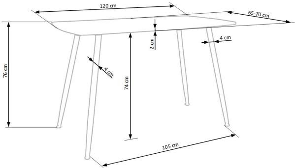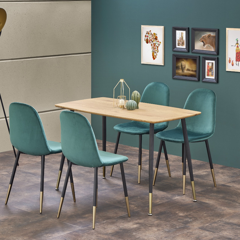 Mérete: 120x70x76 cm (szé x mé x ma) Anyaga: - tölgy színű, MDF asztallap - fekete színű, porszórt acél lábak - arany színű, krómozott lábvégek Az asztal megjelenése igazán a modern kornak megfelelő, színei és anyaghasználata egyedivé és elegánssá teszik. Vendégváró-, étkező-, és kávézó asztalnak egyaránt kiválóan megfelel.