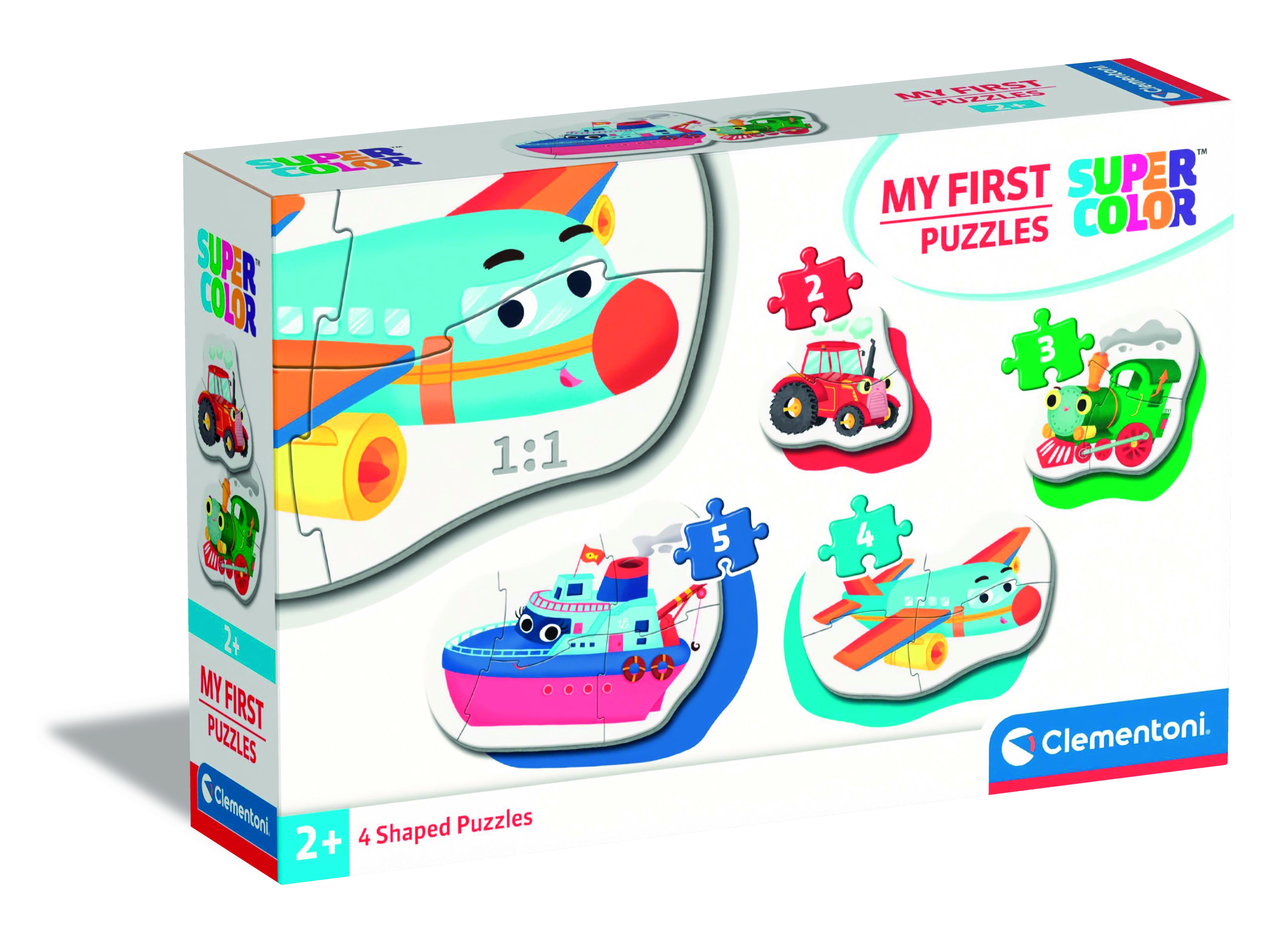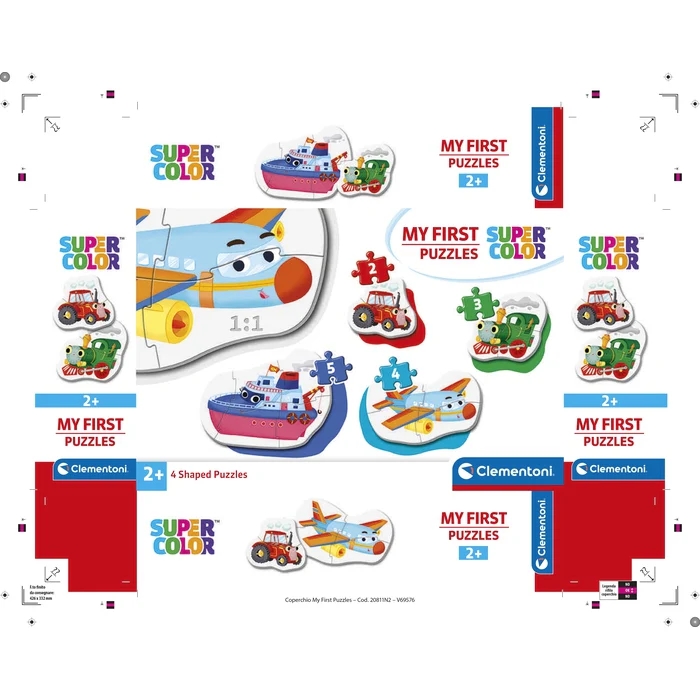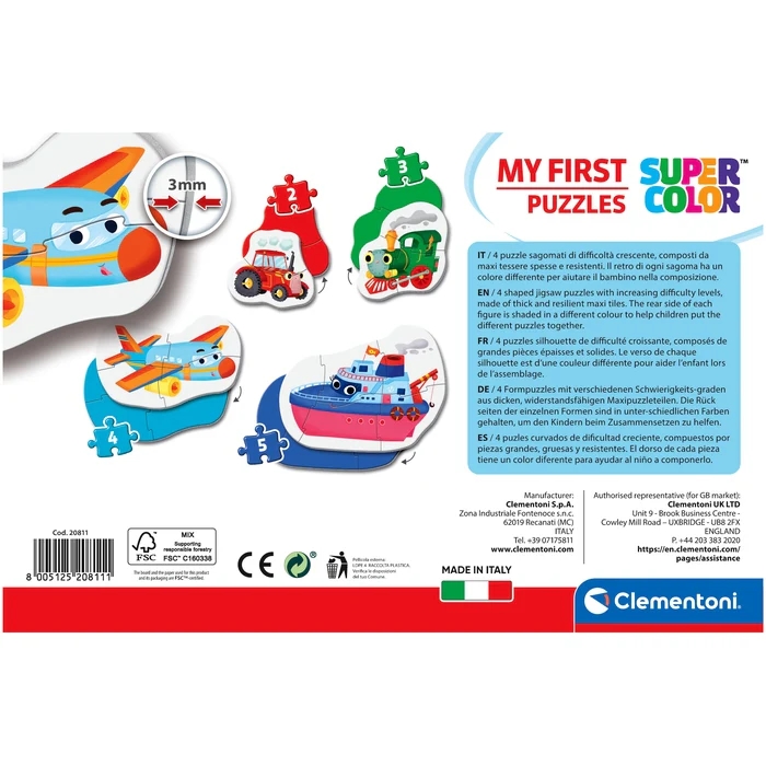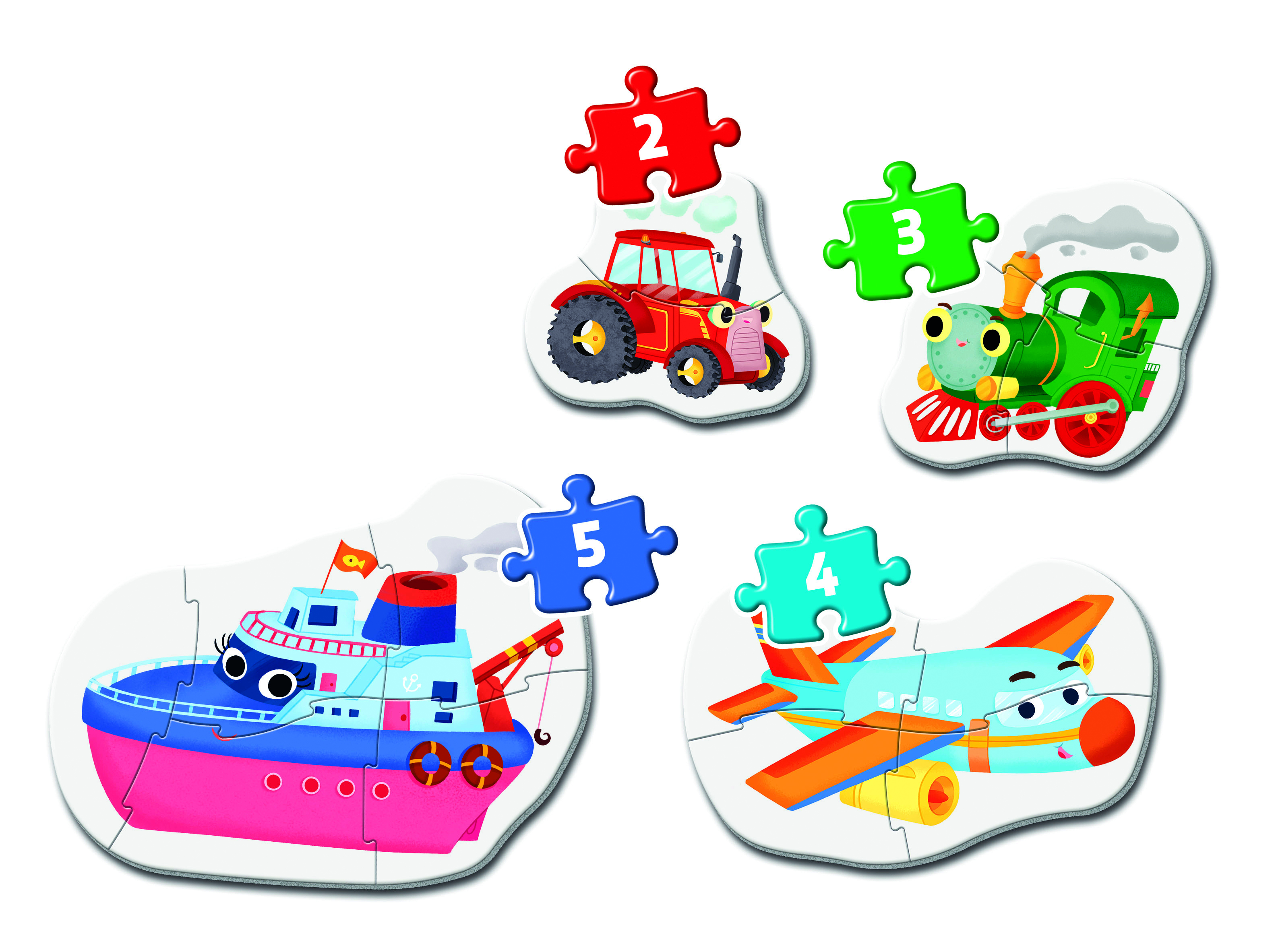 2, 3, 4 és 5 darabos (összesen 14 darabos), négy különböző alakú puzzle, melyek fokozatosan nehezedő szintjeivel egyre nagyobb kihívást jelentenek a gyerekeknek. A legkisebb korosztály számára készült. A puzzle darabkák nagyobbak és vastagabbak a megszokottnál, így a kicsi kezek is könnyen boldogulnak az összeillesztésükkel. Ismerkedj a traktorral, gőzmozdonnyal, repülővel és a hajóval! A lebilincselő képek élénk és ragyogó színekkel segítenek fejleszteni a gyermekek megfigyelőképességét, logikáját és kézügyességét, miközben ismerkednek az járművekkel. Kiváló minőségű anyagból és egy exkluzív nyomtatási technika használatával készültek ezek a szép, élénk és ragyogó képi világú kirakók. 24 hónapos korú gyermekek használatára CE minősítéssel ellátva!