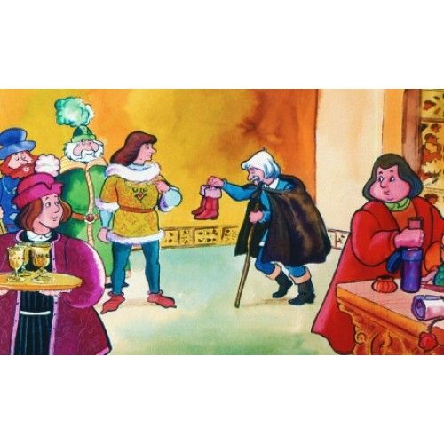 A varga piros csizmát készített a királynak, a palota kapujában strázsáló két őr azonban csak úgy engedi be, ha majdani jutalma egyik felét egyiküknek, másik felét a másikuknak adja. Az eszes varga azonban mégis kincsekkel tér haza.