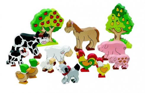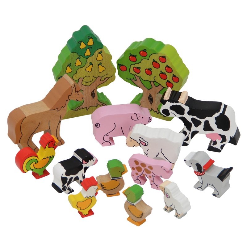 A készletben megtalálható többek között tehén, ló, bárány, disznó, kutya és tyúk, mindegyik vidám színekkel és lekerekített formákkal, a biztonságos játék érdekében.