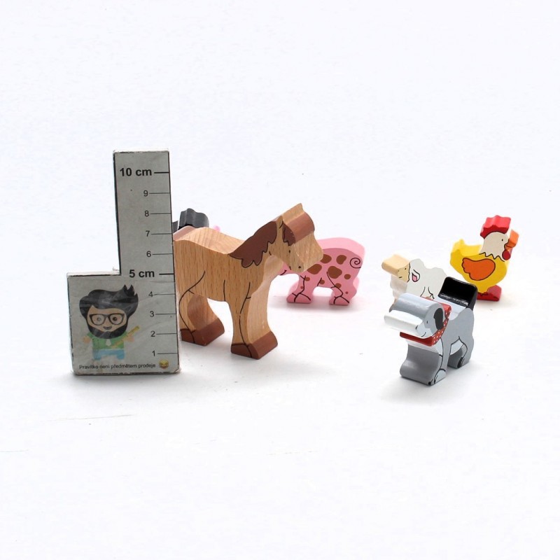 A Goki háziállatok szett 14 darab, különböző méretű (2,5–11,5 cm) fafigurát tartalmaz, amelyek a gazdasági udvar jól ismert állatait jelenítik meg.