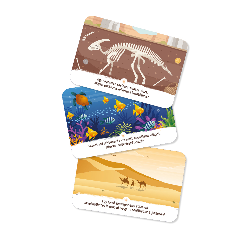 Fejlesztő kártyajáték a kreatív problémamegoldó képesség fejlesztésére. A játék tartalma: -20 db Kalandkártya -20 db Eszközkorong -14 db Képességkorong -1 db Kalandok kapuja / Vezető felfedező kártya -1 db Titokzatos éjszaka / Csodálatos nappal kártya -2 db Megoldókártya a kalandokhoz -1 db Eszközlista -1 db Képességlista -Játékfüzet