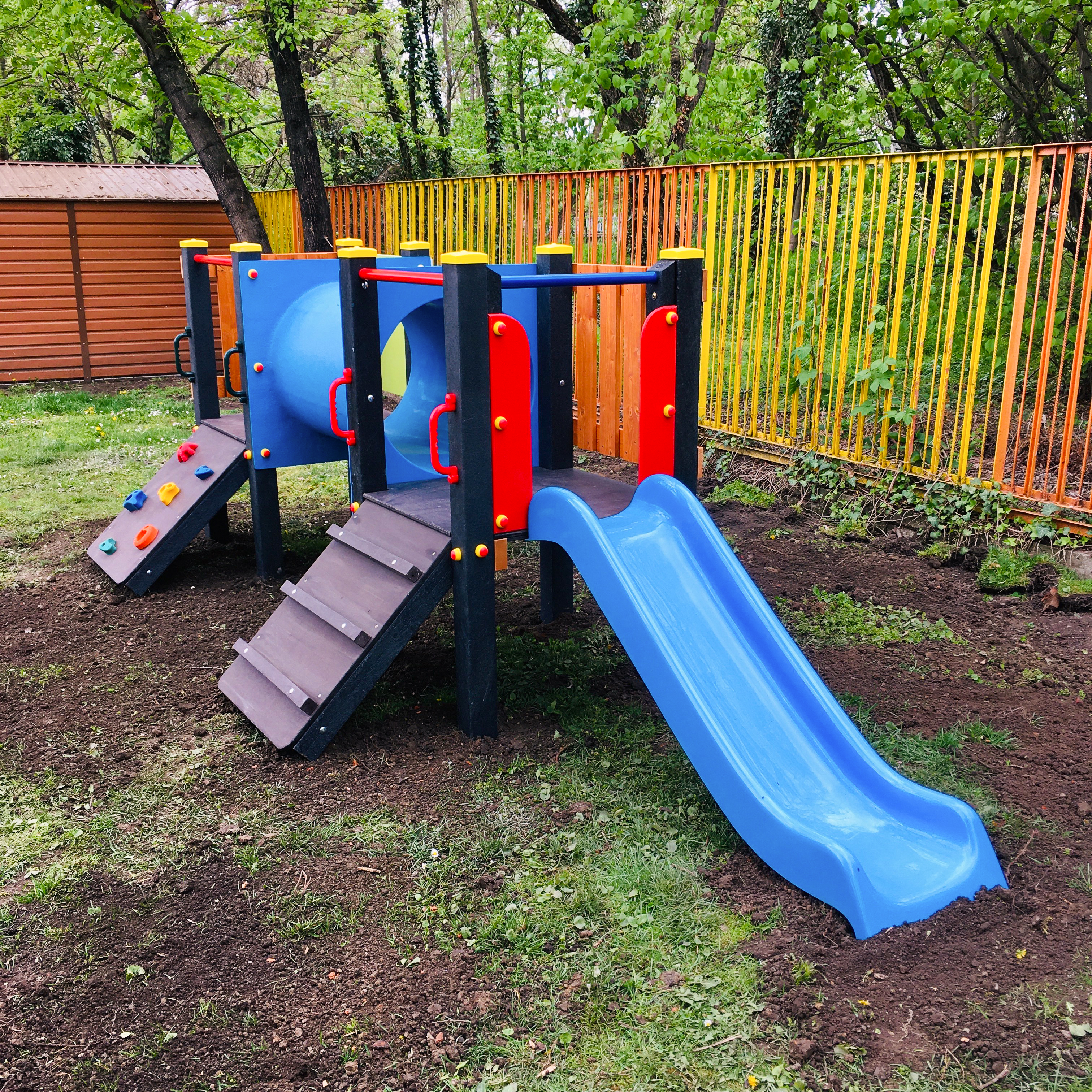 A beülőkaros csúszda biztonságossá, a vidám színű rajzos HDPE oldalak barátságossá varázsolják a terméket.