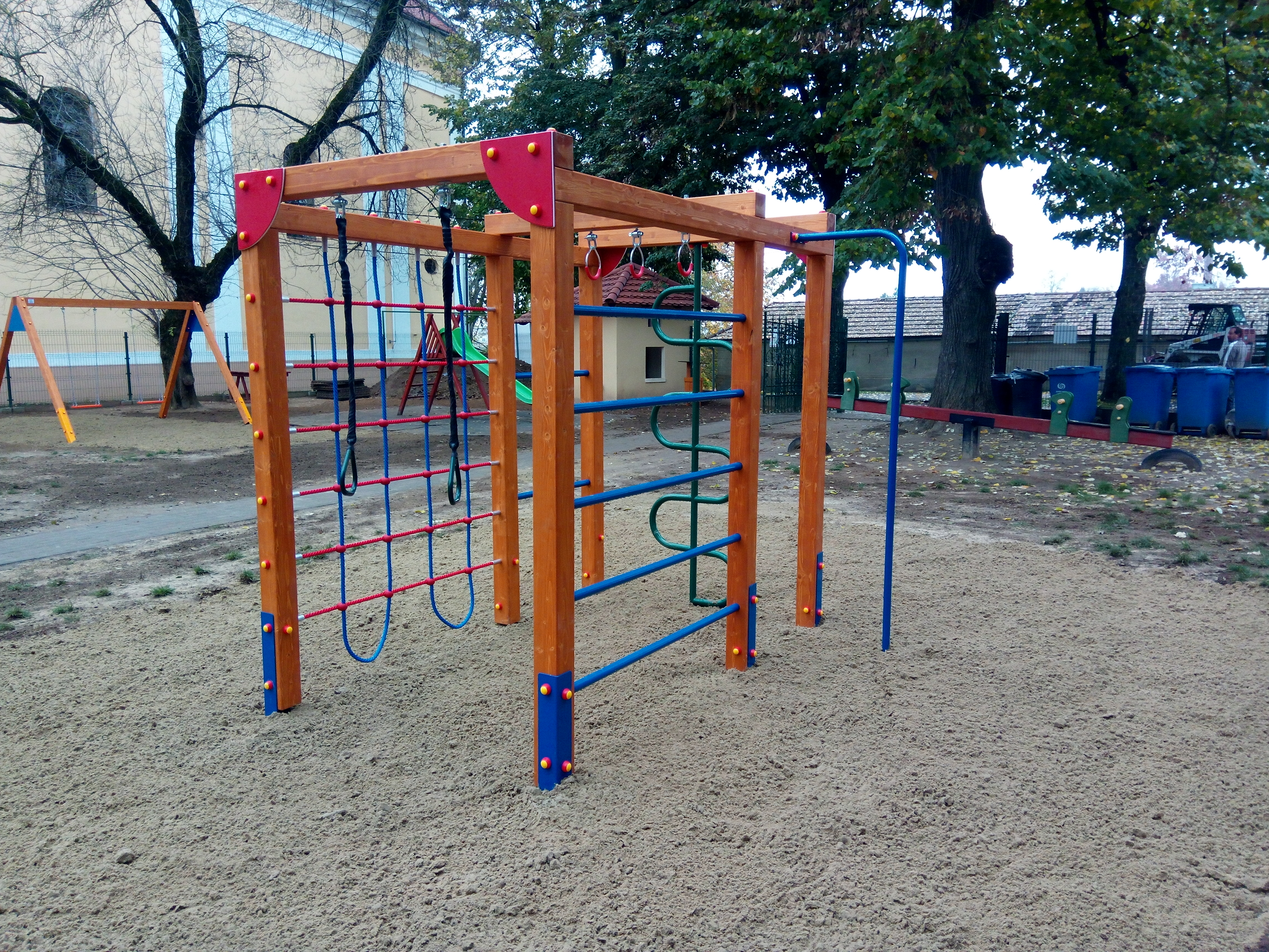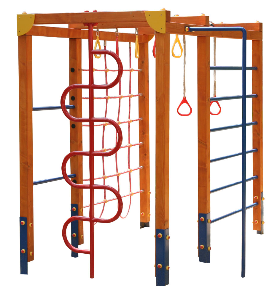 A játszóeszköz az alábbi játszóelemeket tartalmazza: egy tűzoltócső a lecsúszáshoz, egy csimpaszkodó elem, egy gyűrűhinta, egy hullámrúd, egy bordásfal elem és egy kötélháló elem, és a játék tetején csimpaszkodó karikákkal.