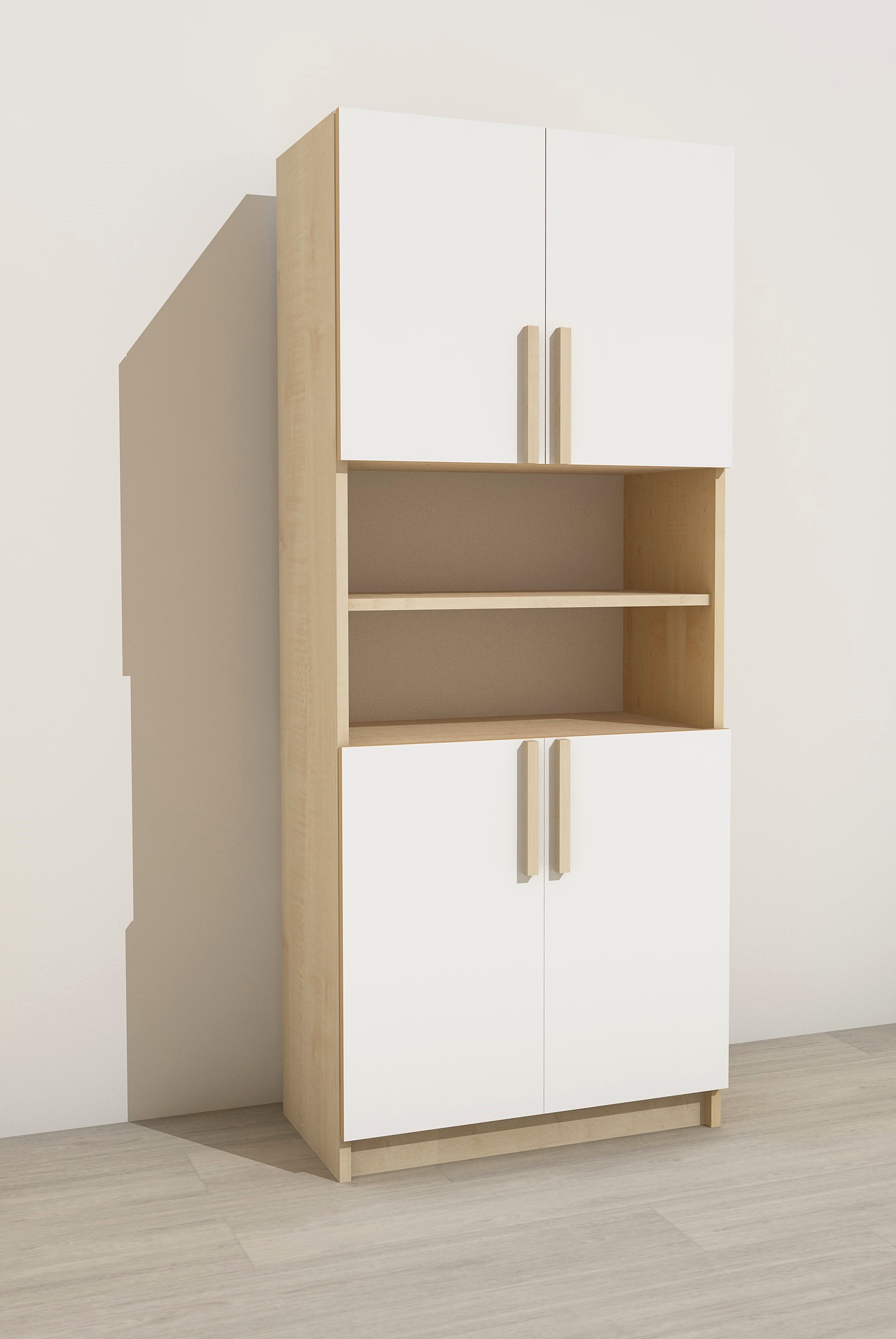 Négyajtós szekrény, középen nyitott polcokkal. Igényes lakkozott díszfaléc fogantyúkkal, díszítőelemekkel kombinálva. Mérete: Szélessége: 75 cm Mélysége: 40 cm Magassága: 180 cm. Az alaptest kellemes juhar, az ajtók fehér színűek. Készreszerelt termék. Anyaga:laminált bútorlap lekerekített ABS élzárással,lakkozott bükkfa díszléc fogantyúval