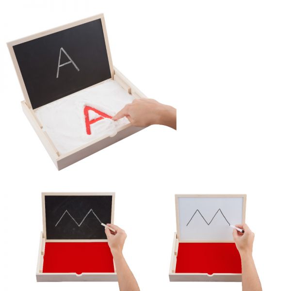 A gyerekek több eszköz segítségével gyakorolhatják a vonalvezetést, majd az írást is. Táblafilccel, fehér krétával és homokba írással is próbálgathatják az egyes betűk és írásjelek írását.