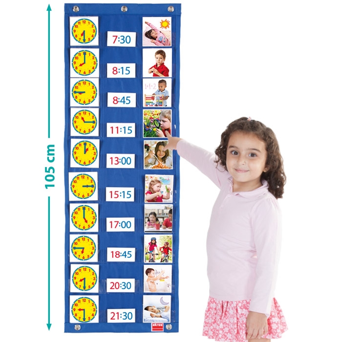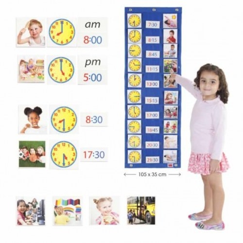 Tartalma: - 1 db tábla - 36 db kép - 36 db óra - 72 db időpont kép - 12 db napszakot jelölő kép - 1 db táska Mérete: 105x35 cm