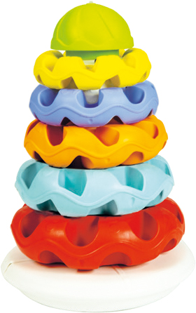 A szett öt különböző méretű gyűrűt tartalmaz, amelyeket méret szerinti sorrendben kell a tartó oszlopra helyeznie gyermekednek.