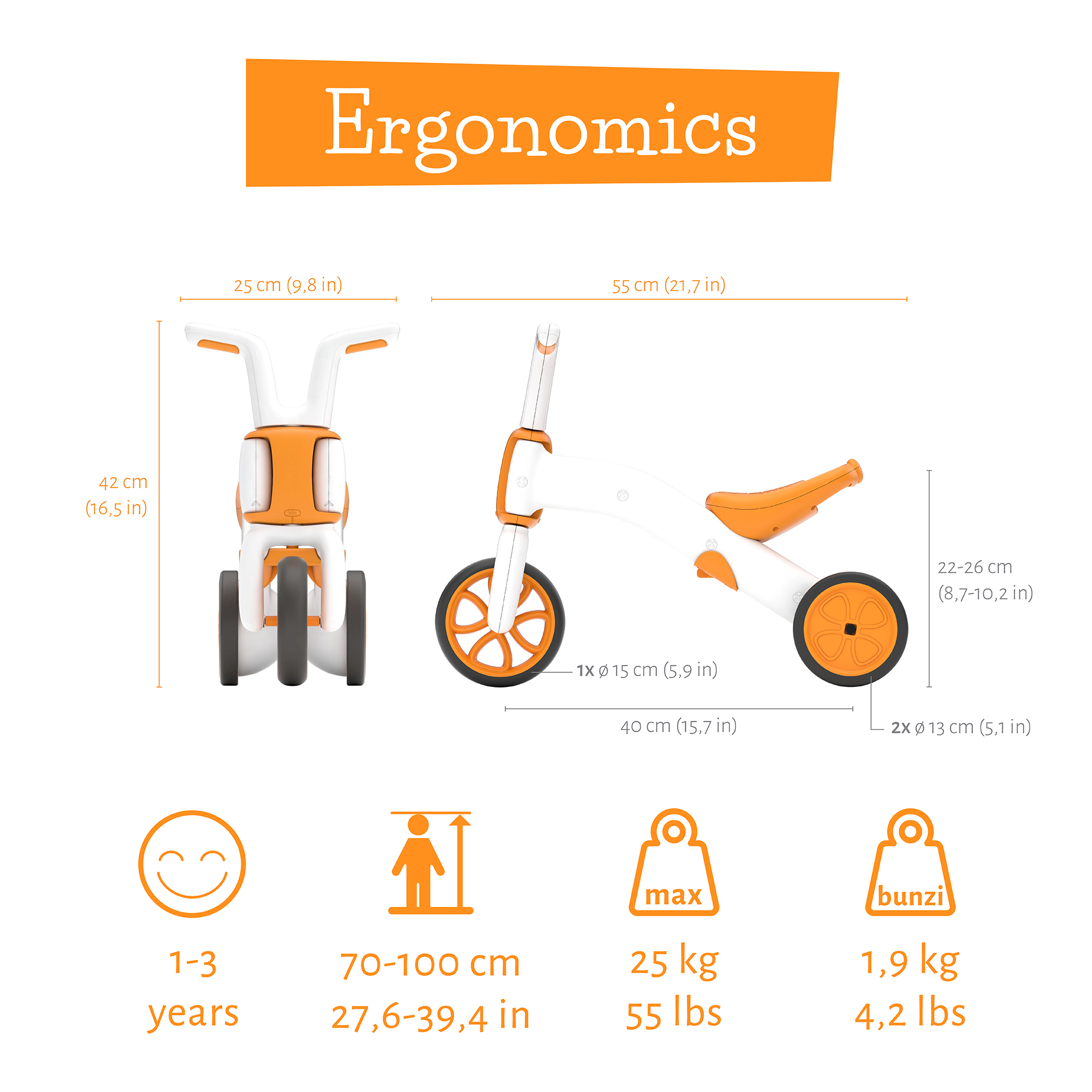 Tulajdonságai: - 1-3 éves kor között ajánlott - 2 üléspozíció: 22 cm, 26 cm - Maximális terhelhetőség: 25 kg - A kis kincsek tárolására az ülés alatt egy tároló található. - Az összeszerelése egyszerű, nem igényel szerszámot! Kerekei gumírozott felülete nem hagy csíkot se beltéren, se kültéren. Bunzi méretei: - magassága: 42 cm - kormány szélessége: 25 cm - teljes hossz: 55 cm - első kerék átmérője: 15 cm - hátsó kerekek átmérője: 13 cm - súlya: 1,9 kg Színe: mandarin sárga 12 hónapos korú gyermekek használatára CE minősítéssel ellátva!