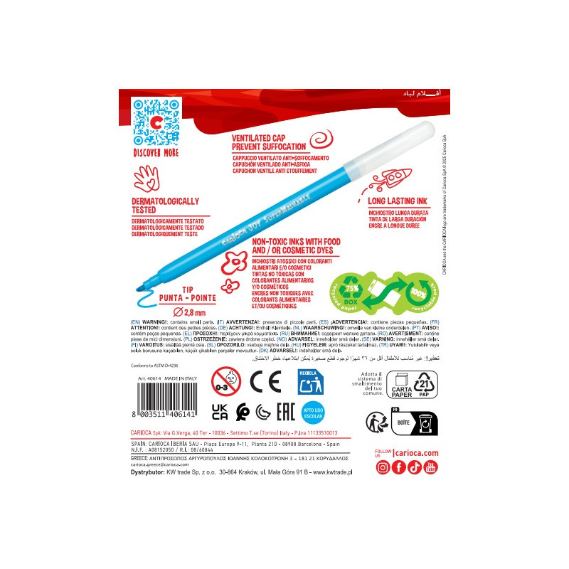 12 db-os filctoll szett élénk színekkel és szuperkönnyen mosható tintával készült. Biztonságos,tesztelt termék, amely ideális gyerekek számára.