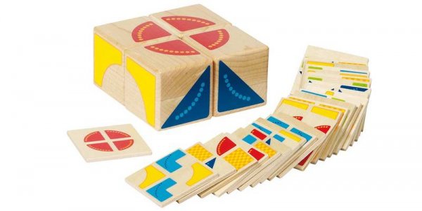 A készletben 4 darab tömör, fából készült kocka és 26 db szintén fából készült, festett feladatlap található. A termék mérete: 8x8x4 cm