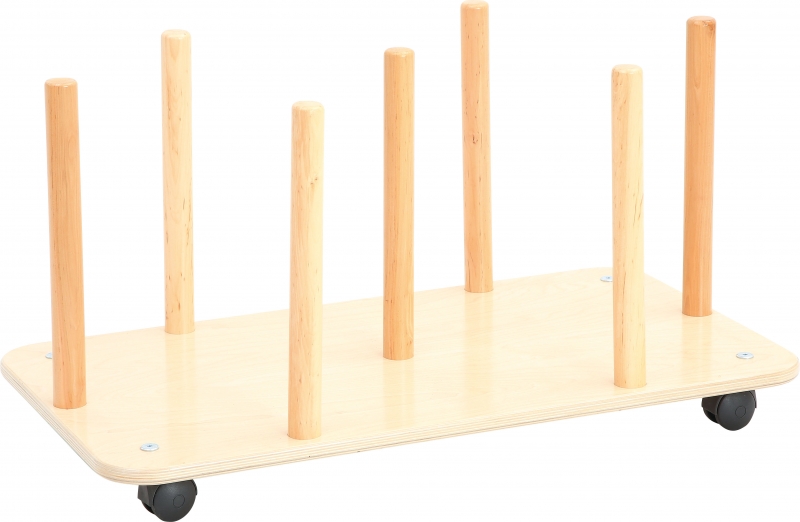 A négyzet alakú ülőpárnákhoz megalkotott fa tároló 20 db ülőpárna tárolására alkalmas. Kerekeinek köszönhetően könnyedén mozgatható. A tároló alsó deszkájához 6 db rúd csatlakozik, melyek stabilan és rendezetten tartják a párnákat. A tároló anyaga 18 mm vastag, lakkozott rétegelt lemez. Mérete: 84x46x42,5 cm