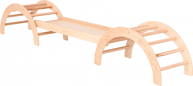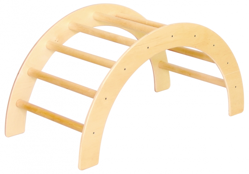 A félkör alakú, tömör fa mászóka fejleszti a gyermek egyensúlyozó képességét, nagy mozgását, a szem-kéz és a szem-láb koordinációját.