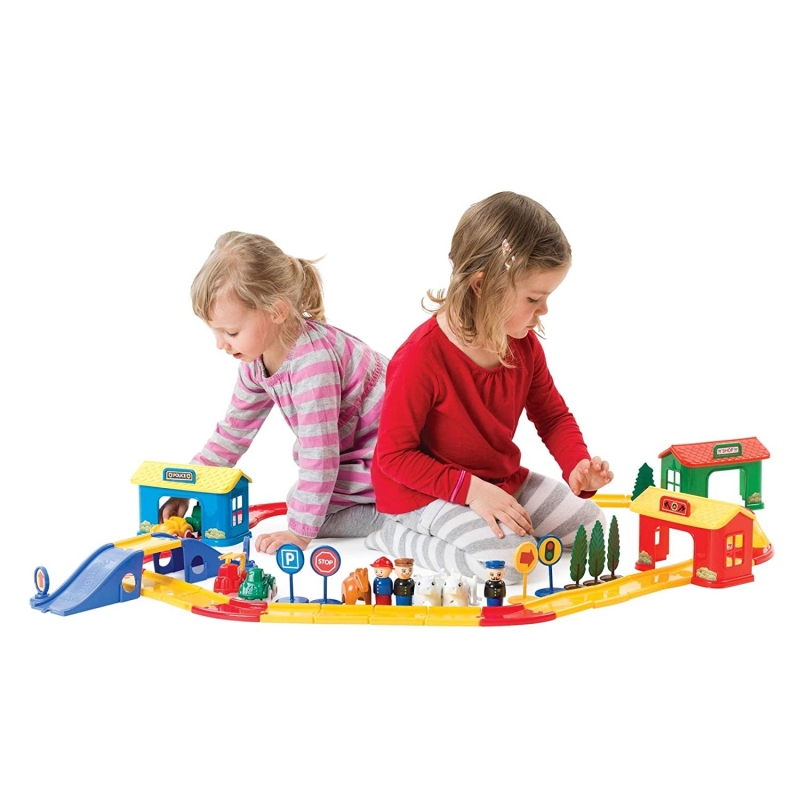 A pályaelemek és az épületek rugalmas, hajlítható, mégis strapabíró műanyagból készültek, így biztonságos és tartós játékélményt nyújtanak.