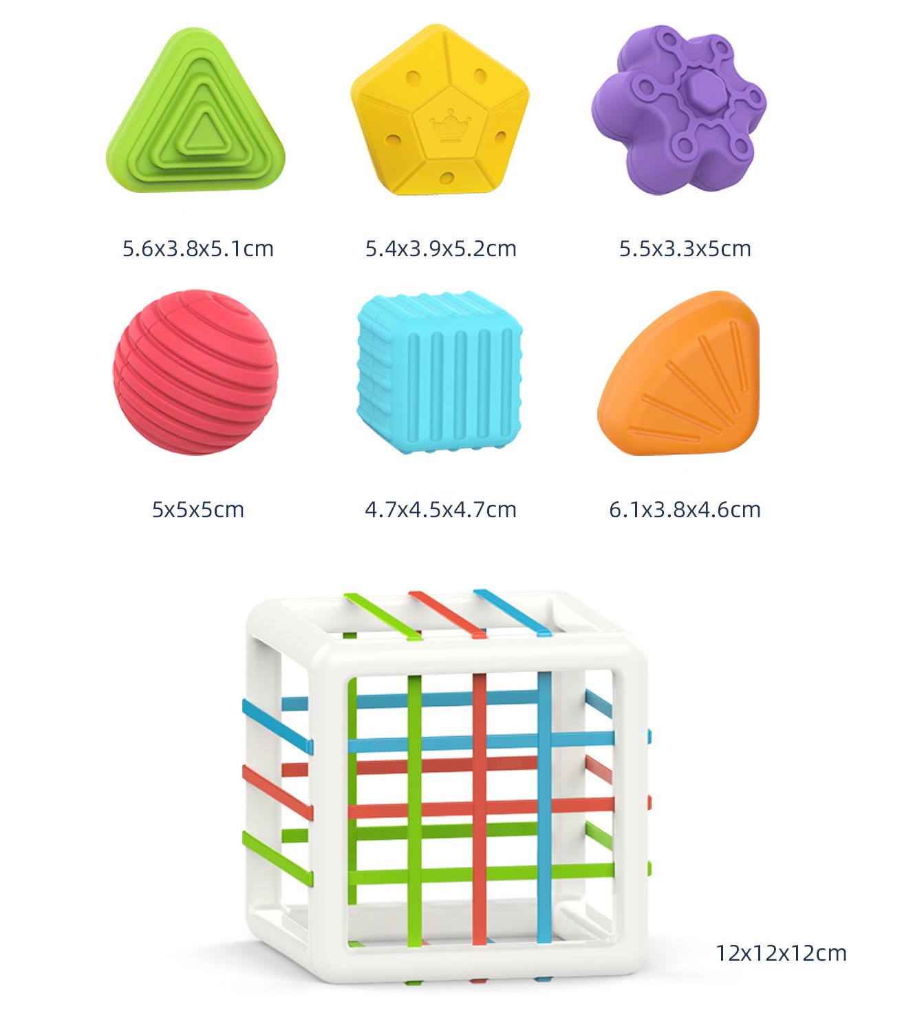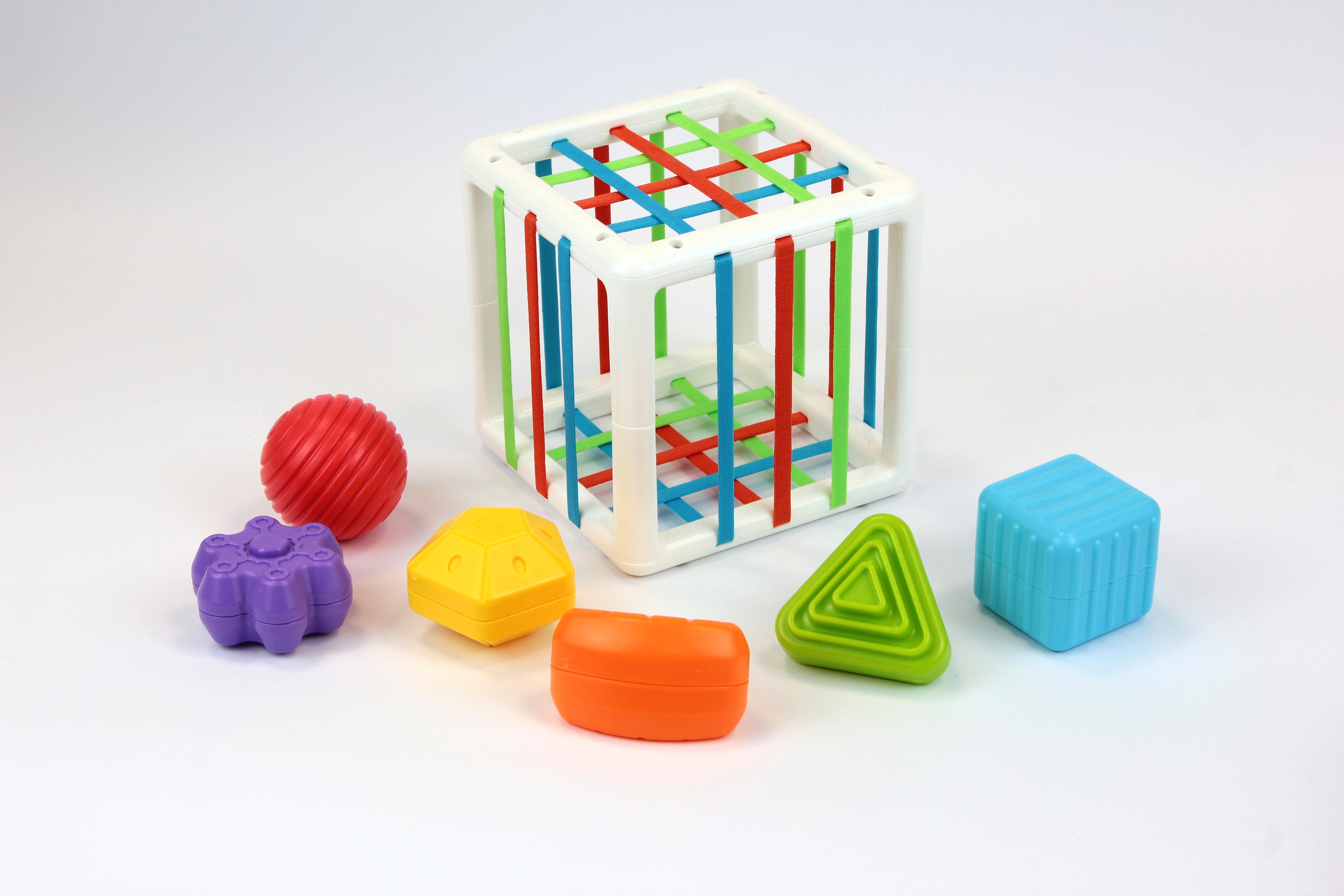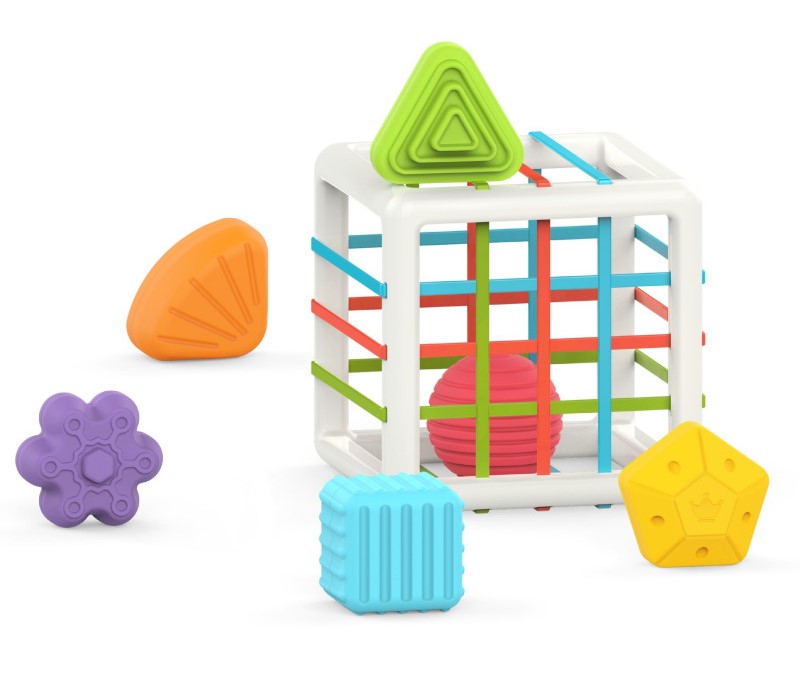 Fejlesztő kocka különböző formákkal és szenzoros elemekkel