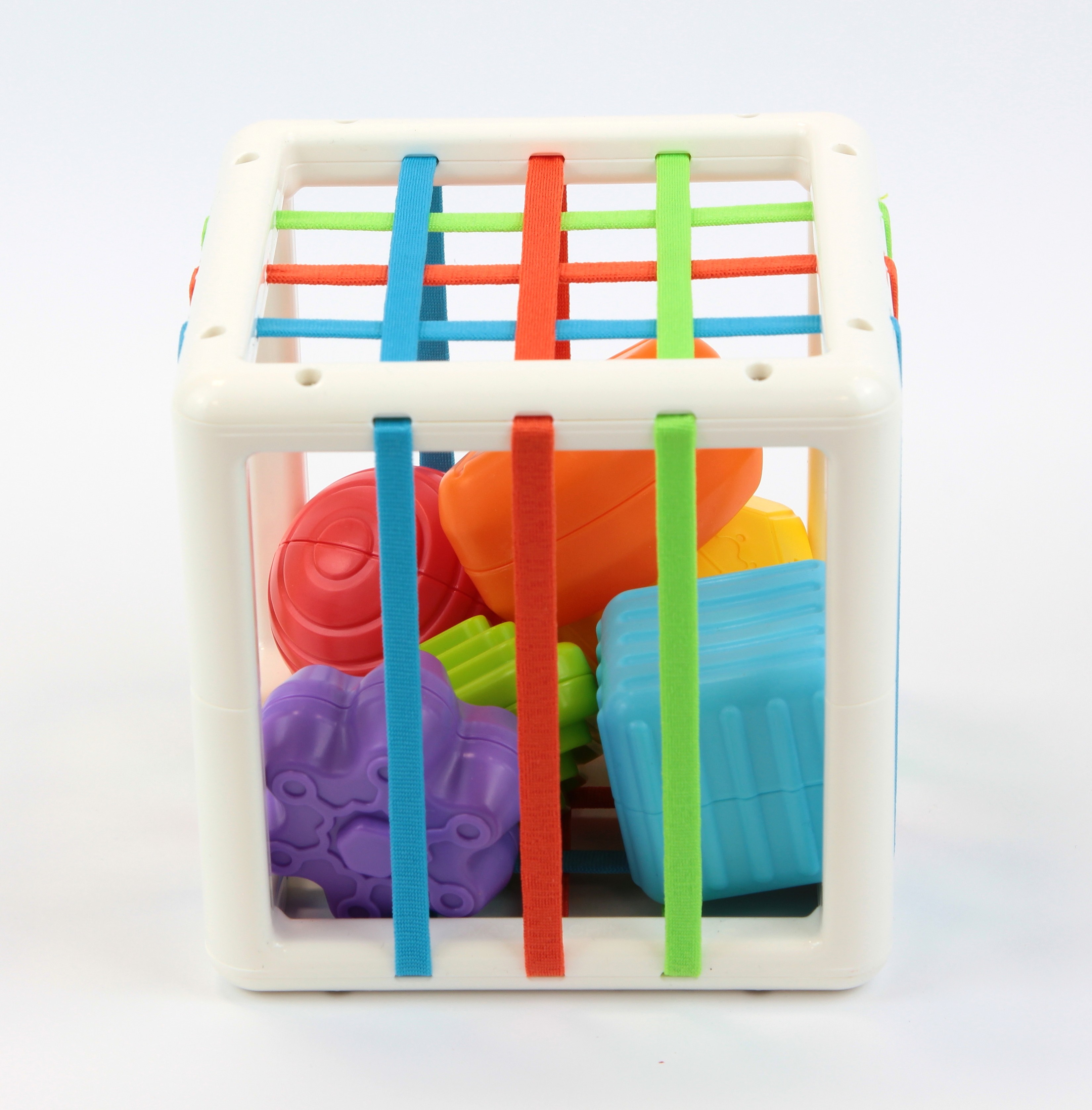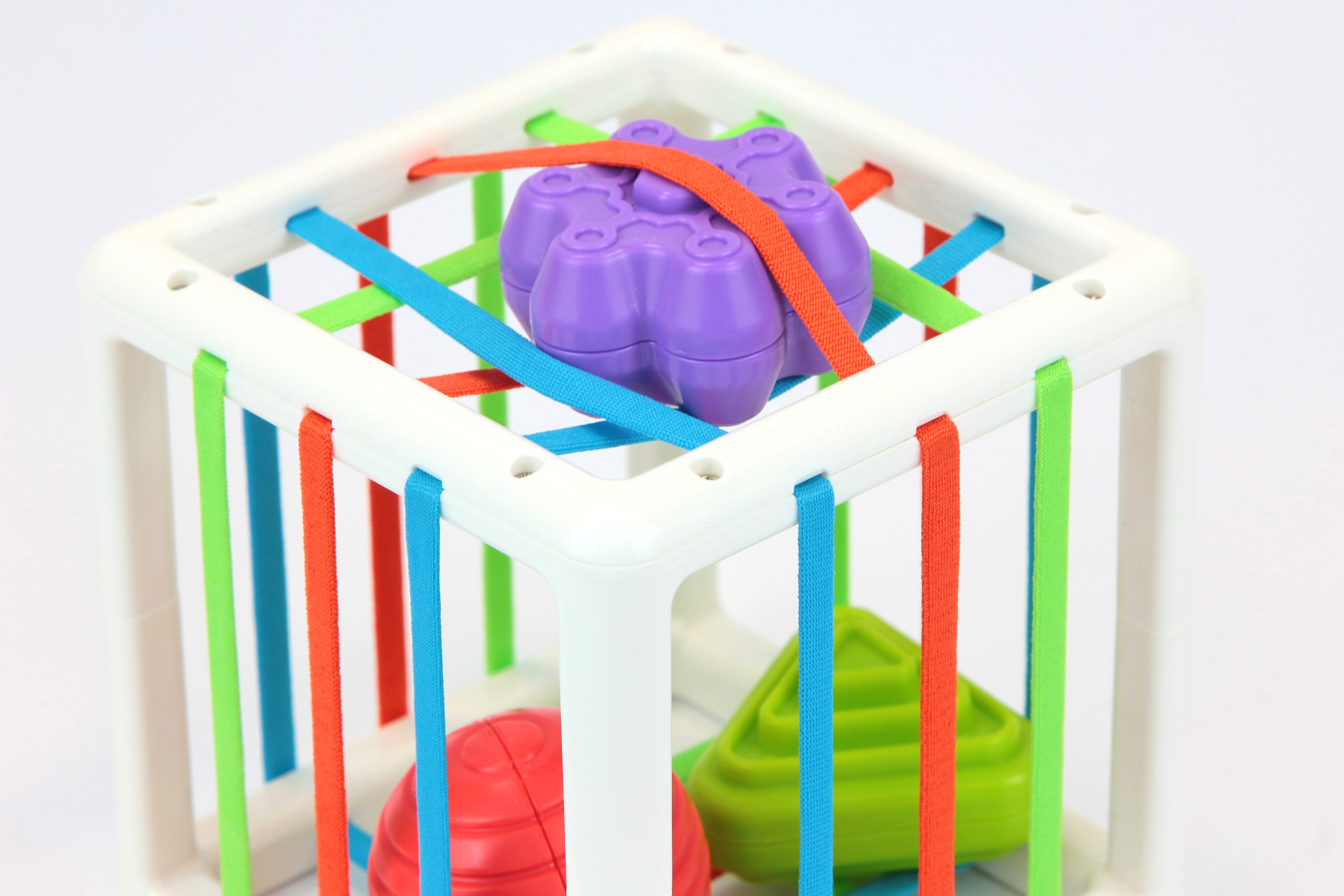 A kocka oldalait színes, rugalmas gumiszalagok (3, vagy 6 db) zárják le, amelyeken keresztül a gyermeknek lehetősége van a különböző formák be- és kihúzására.