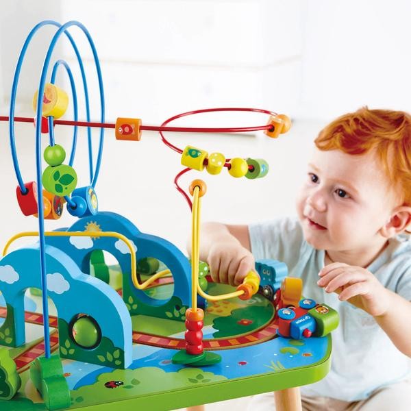 Hape Vonatozás a dzsungelbe-Tekergő asztal - 18 hó+ A termék mérete: 60x40x69 cm Az asztalon megtalálhatók a következők: 4 db golyóvezető pálya, piros, kék-sárga színekben. A kacskaringós pályákon többféle színű golyót és hengert lehet végig vezetni. Egyes elemeken katica, csiga, méhecske, stb. láthatók. A golyóvezetők alatt egy kisvonat fut, melynek mágnessel összekapcsolhatóak a kocsijai. 1 db majmos mozdony 1 db oroszlános vagon 1 db elefántos vagon. Az alagutakon nem csak a vonat haladhat át, hanem a lyukakon golyók is átvezethetők. 18 hónapos korú gyermekek használatára CE minősítéssel ellátva!