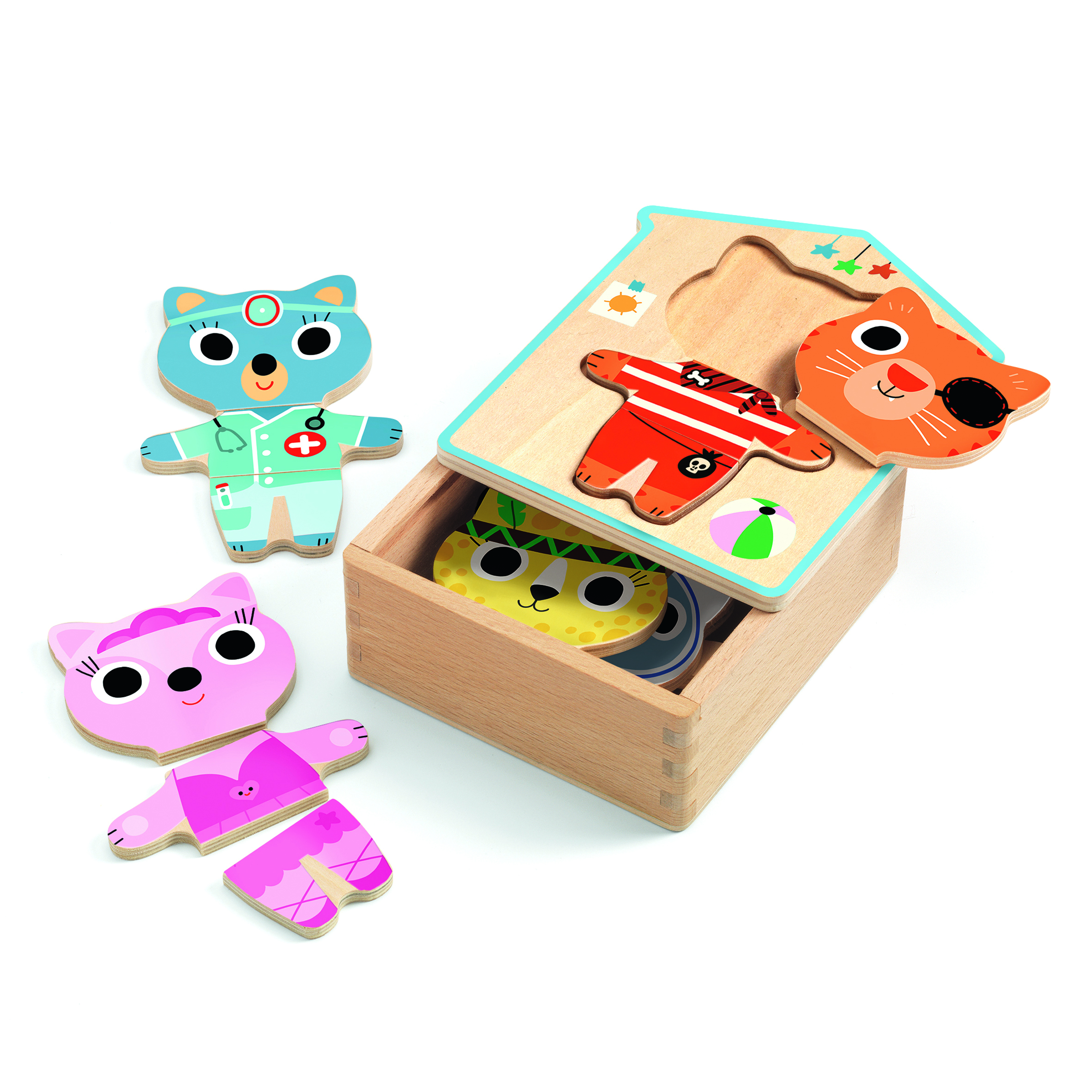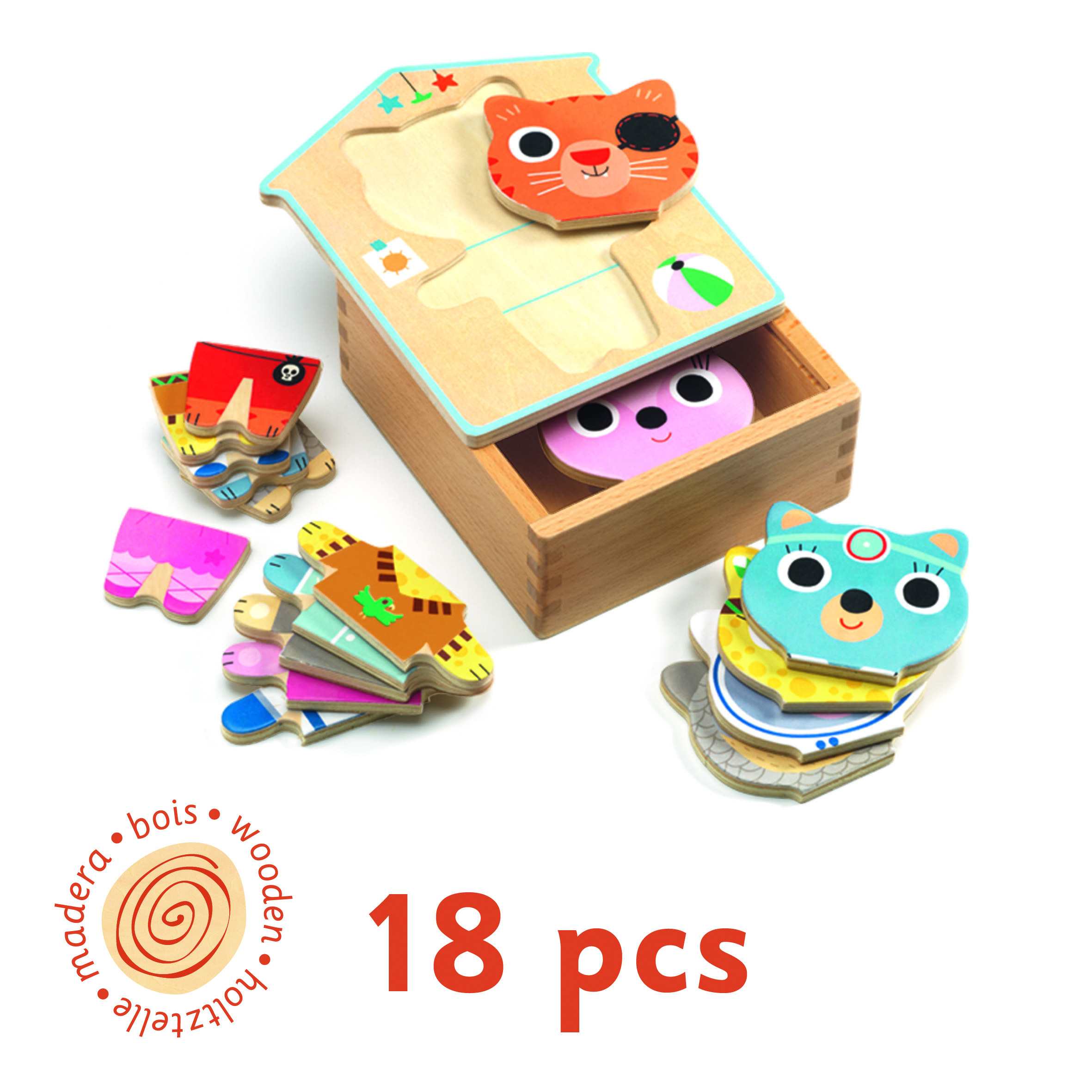 A készlet 18 db puzzle elemet tartalmaz, amelyek lehetővé teszik a gyermekek számára, hogy különböző családtagok képeit rakják ki. A puzzle elemek logikus felbontása segíti a kicsiknek a kicsi-nagy, kisebb-nagyobb relációk megértését, miközben fejlesztik tapintásos érzékelésüket is.