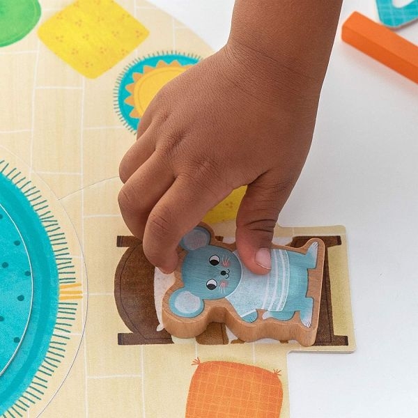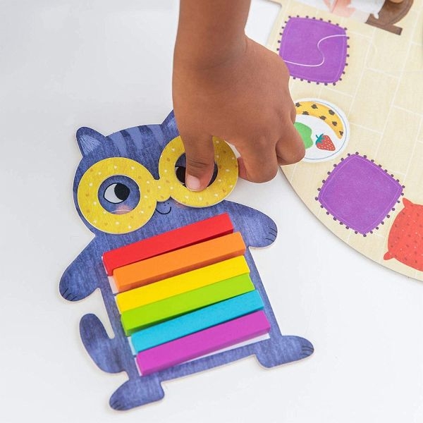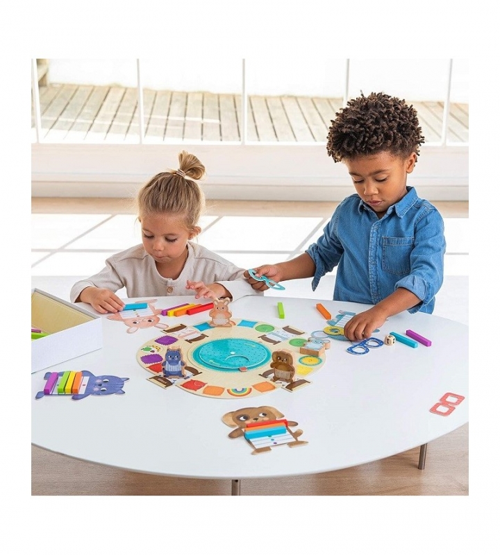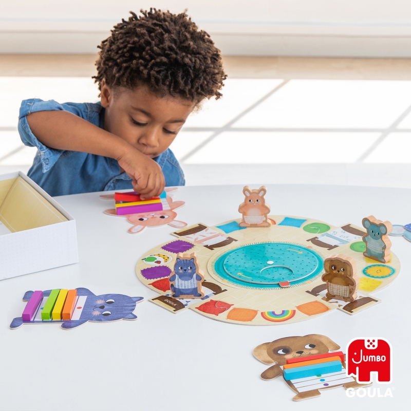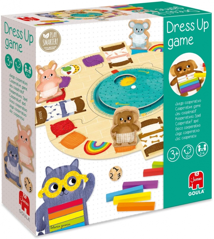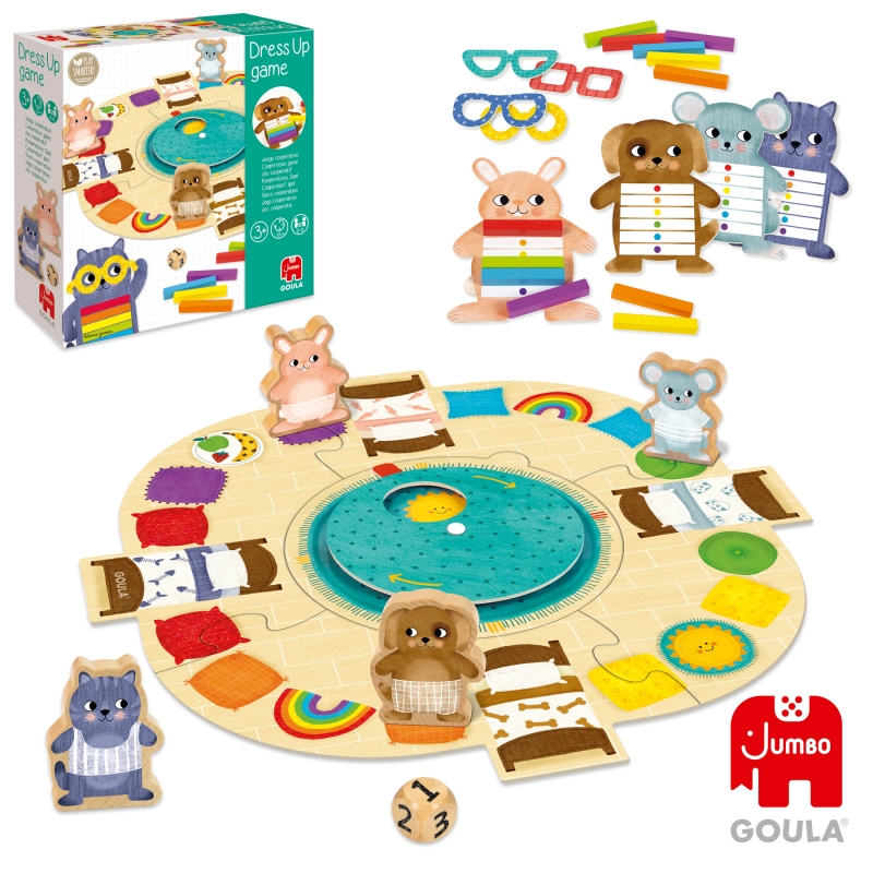 Jó reggelt! Öltöztess fel színekkel!, GOULA Kooperatív és egymással versengős játékszabály szerint is játszható. A kicsik a játék közben ismerkedhetnek a színekkel. Tartalma: 1 db karton játéktábla, 4 db szín jelölő kártya kartonból, 1 db fa dobókocka, 4 db karton állat figura: kutya, egér, cica, nyuszi, 24 db fa színes tégla test-6 különböző színben, 4 db karton, különböző színű játék szemüveg . A doboz mérete: 23x23x6 cm Játékidő: 10 perc Ajánlott korosztály: 3 Év