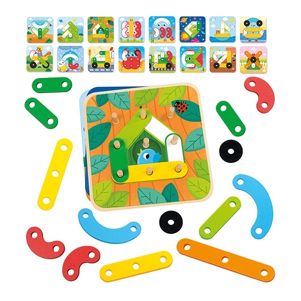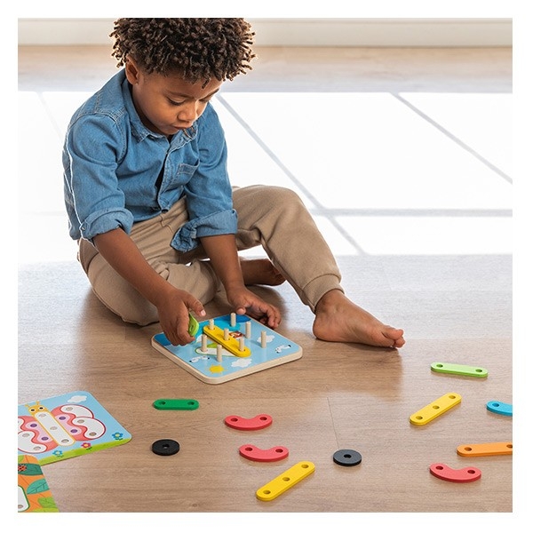 A készlet tartalma: - 1 db 18x18 cm-es fa alaptábla 9 tüskével. - 22 db fa elem, 6 különböző színben és 6 különböző formában (egyenes, ívelt és kör alakú), melyek a tüskékre illeszthetőek. - 8 db két oldalas mintalap, mely könnyedén a tüskés alaplapra illeszthető. - 1 db ötletfüzet 41 különböző feladattal.. A doboz mérete: 30,2x22,3x5,3 cm