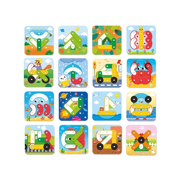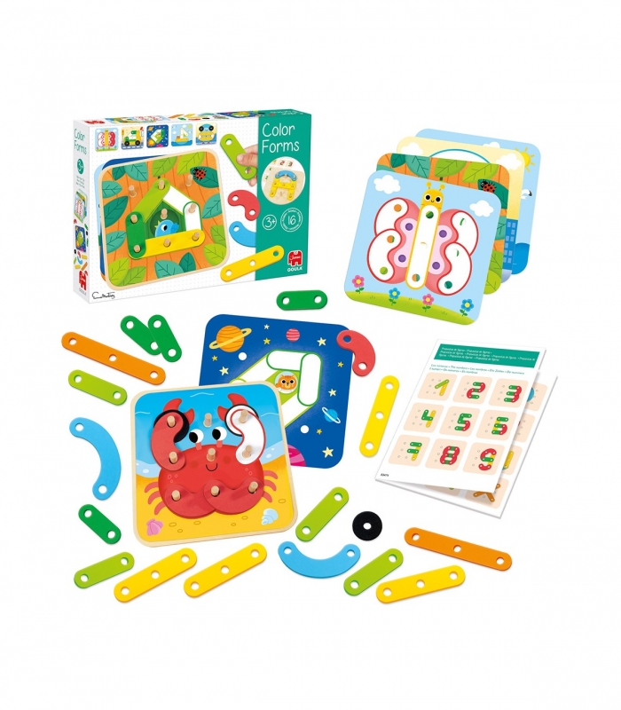Fejleszti a szín- és formafelismerést, a finommotorikus készségeket és segít elsajátítani az ABC betűinek és a számoknak a képeit.