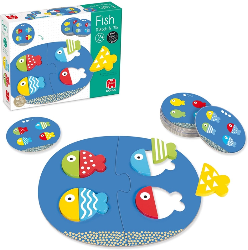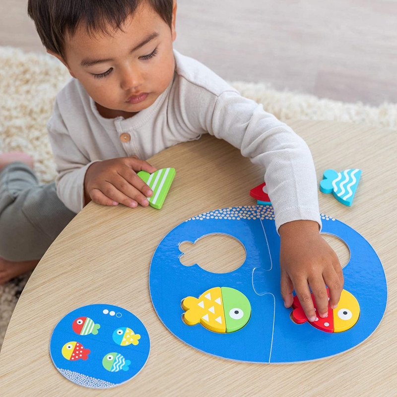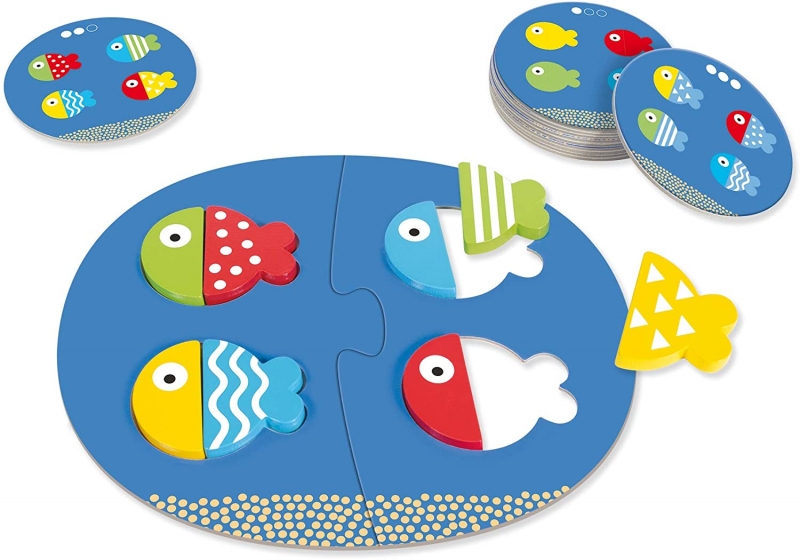 Szín- és mintafelismerő játék kicsiknek. Készlet tartalma: 2 db nagy kék puzzle darab amiből 1 alaptábla rakható ki 4 db különböző színű és mintájú fa halacska (mind félbe vágva, ezért összesen 8 db forma) 12 db kétoldalas kerek feladatkártya, 3 nehézségi szinttel megjelölve. Feladat: a feladatlapoknak megfelelően kell szín és forma szerint összeállítani a halacskákat. 2 éves korú gyermekek használatára CE minősítéssel ellátva! A doboz mérete: 24,5x19x6 cm