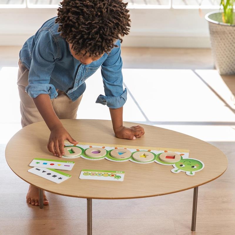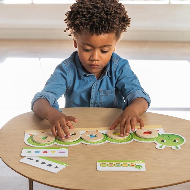 A puzzle elemekből álló, mosolygós hernyó testére kell a kártyákon szereplő feladatok szerint helyes sorrendben felrakni először a színes karton korongokat, majd a fából készült forma korongokat.