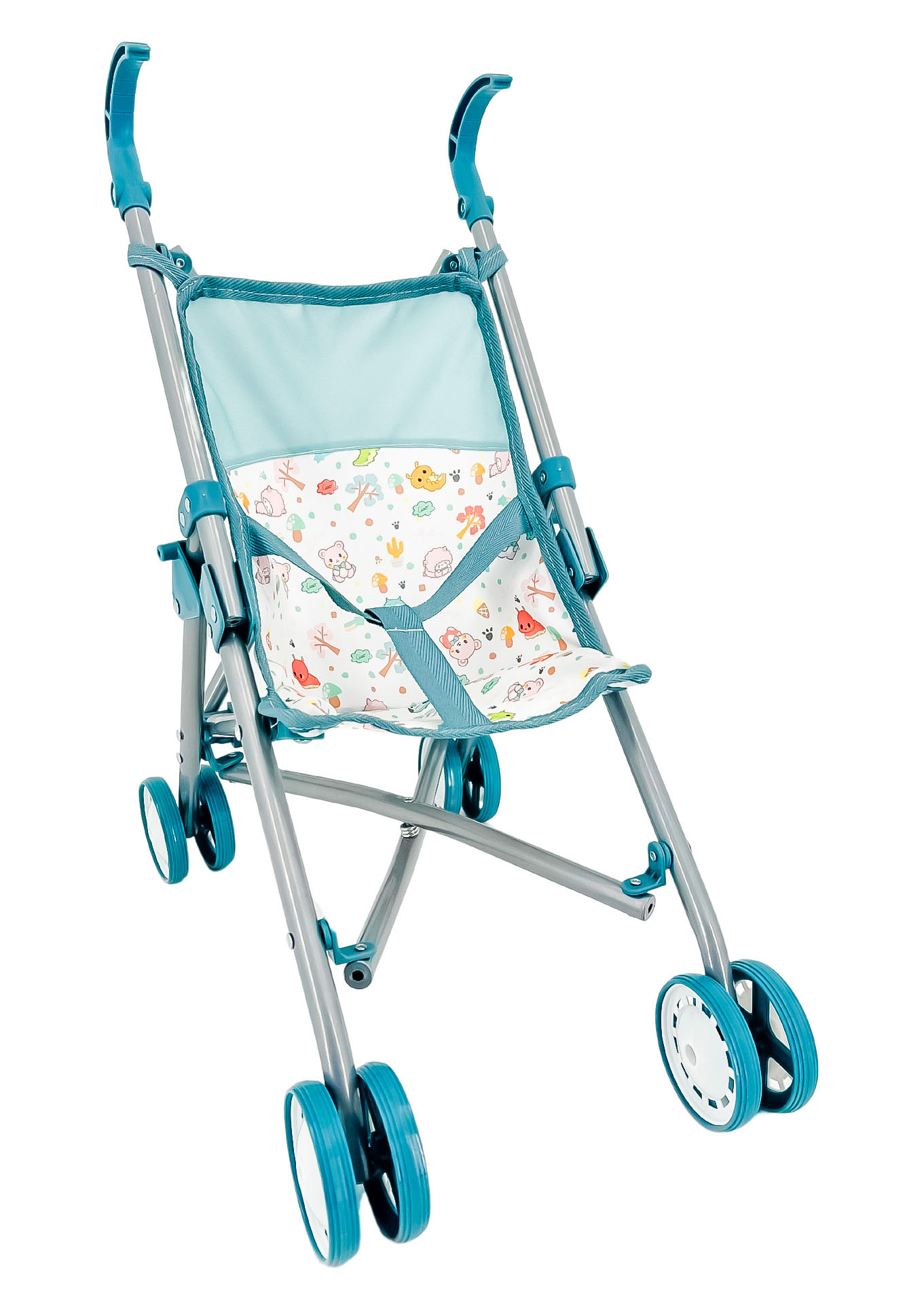 Összecsukható, fémvázas babakocsi, játékbabák számára, mérete: 21,5x36x46 cm A bájos, pasztellkék-fehér színvilág és a kedves erdeiállat-figurák barátságossá teszik a játékot minden gyerek számára.