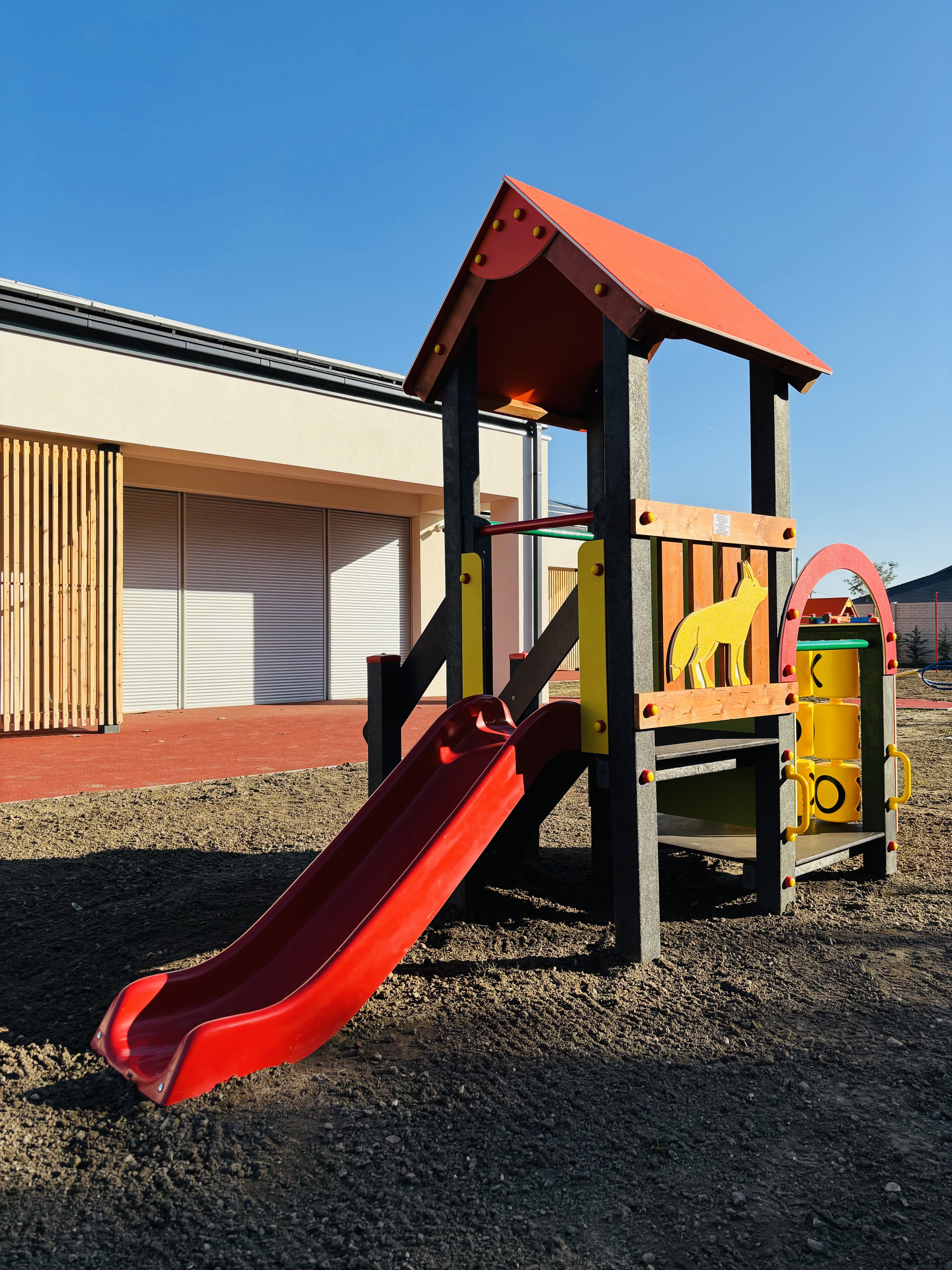 Bölcsődei csúszdatorony, ferde rámpával és műanyag amőba játékkal.