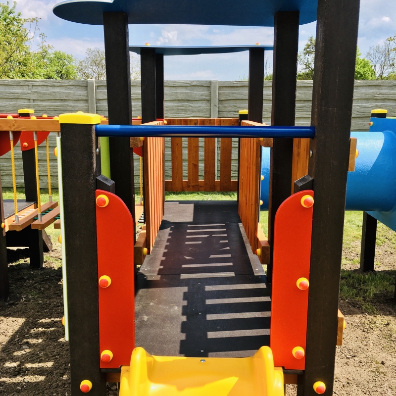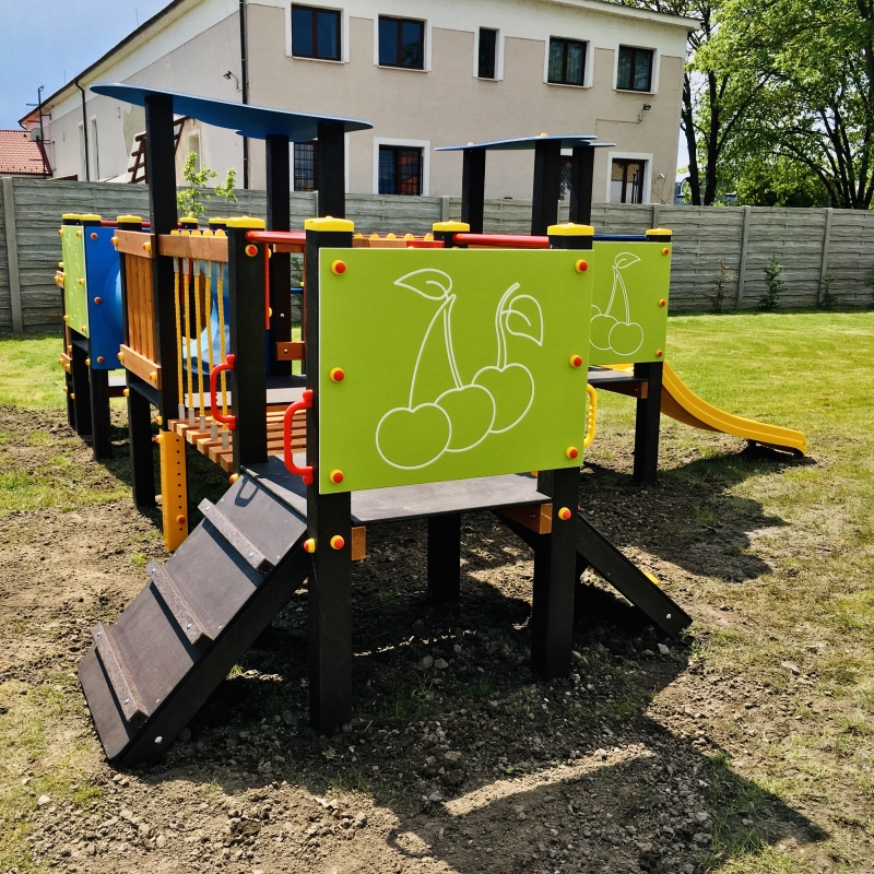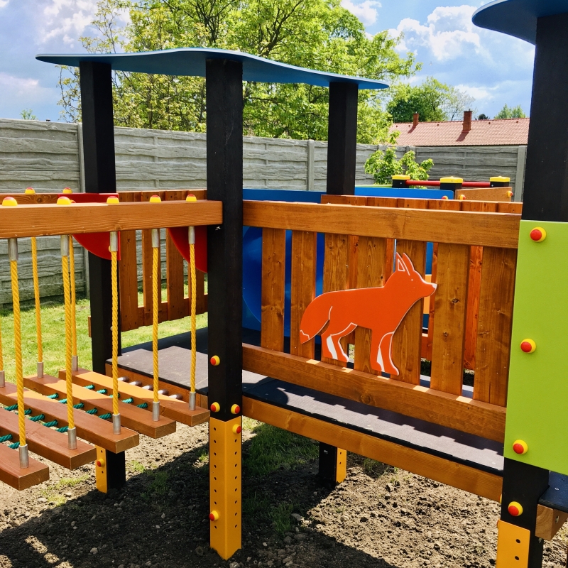 A fém tartólábak, a HDPE műanyag toronytető és a díszített színes műanyag oldalelemek növelik a játszóeszköz élettartamát és esztétikus külsőt kölcsönöznek a terméknek.