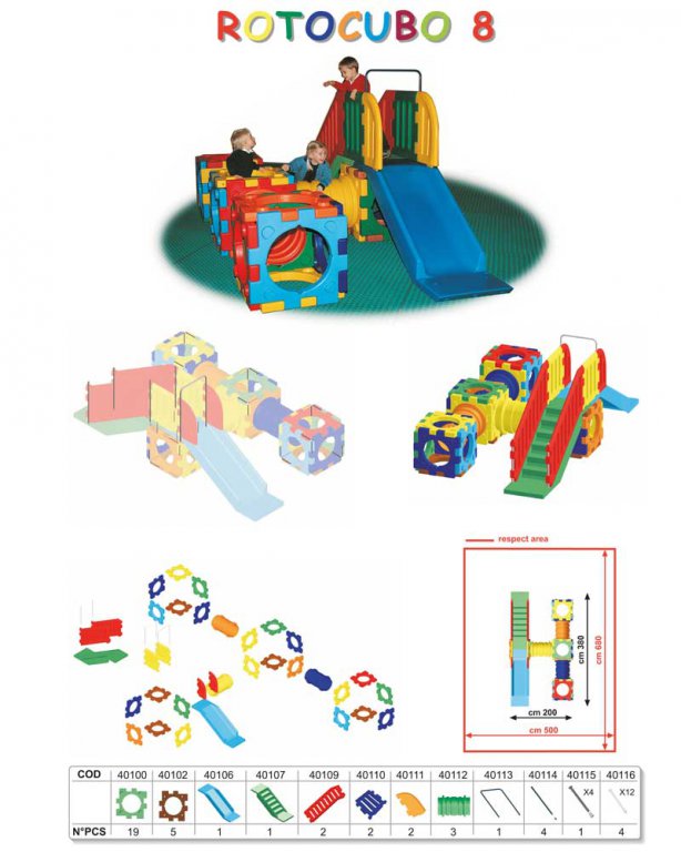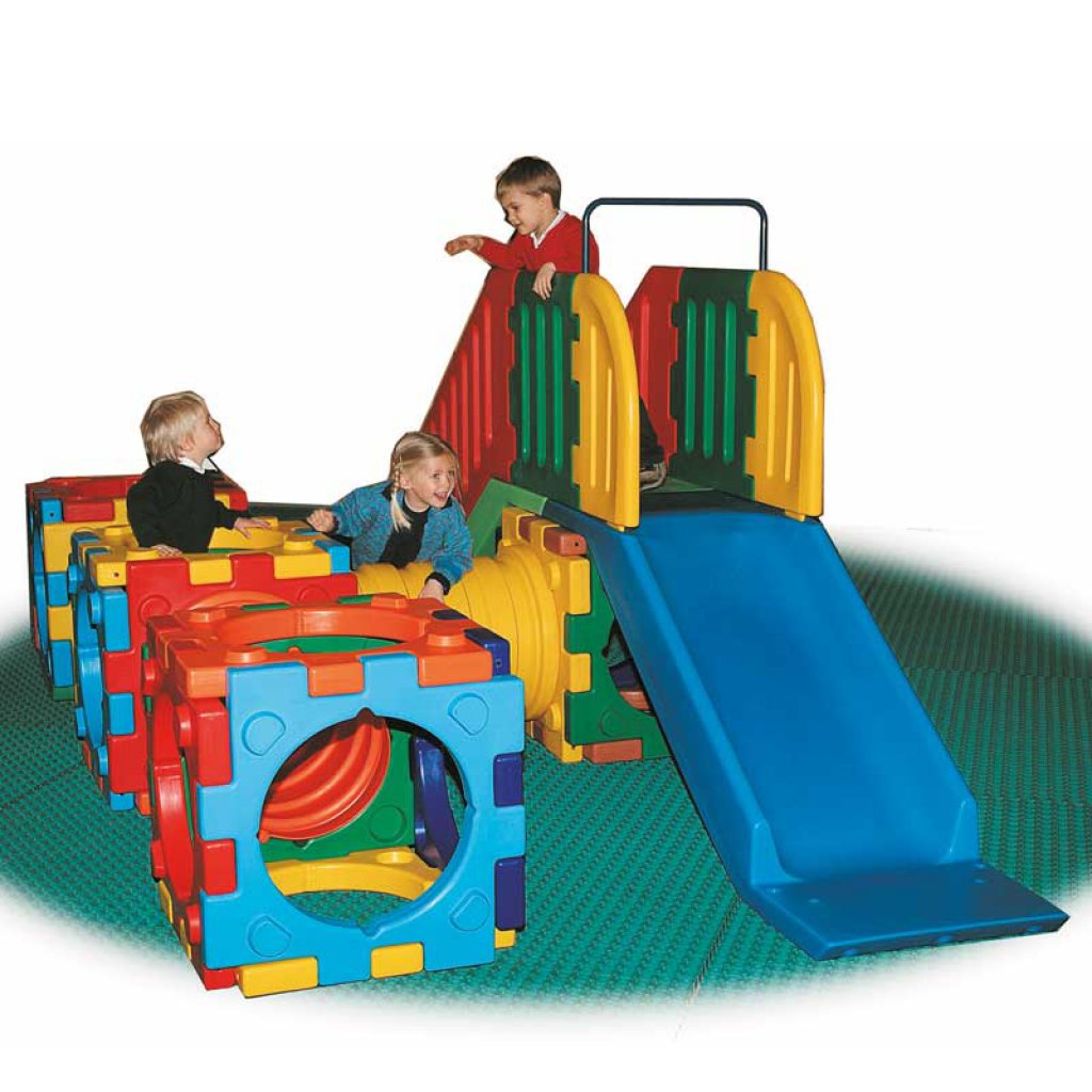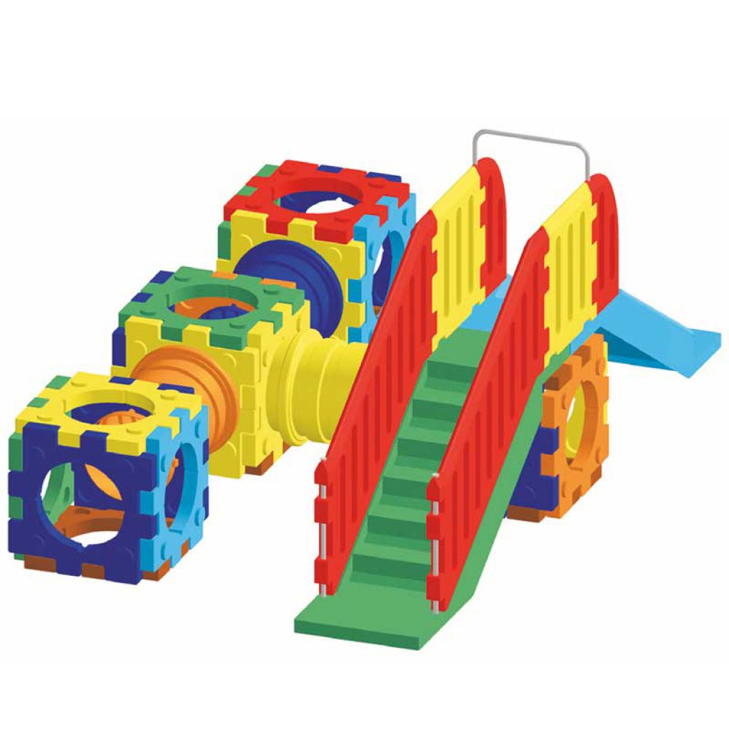 Tartalma: - 24 db 66x66x6 cm-es elem - 1 db 200x45 cm-es csúszda - 1 db 200x45 cm-es lépcső - 2 db 200x45 cm-es korlát - 2 db 66x66x6 cm-es korlát elem - 3 db 84 cm-es átmérőjű csőelem. Termék mérete: 379x195 cm