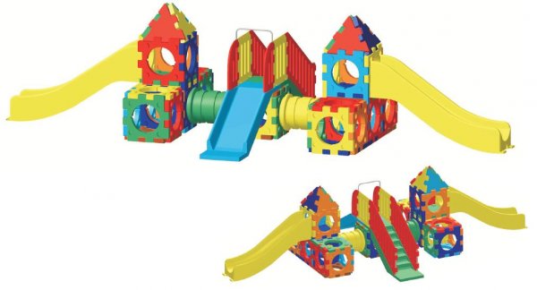 Tartalma: - 30 db 66x66x6 cm-es panel - 10 db dupla panel - 2 db alagútelem - 2 db csúszda - 1 db lépcső korláttal és csúszdával - 8 db tetőelem. Az elemen lévő lyuk átmérője 44 cm. 2 éves korú gyermekek használatára CE minősítéssel ellátva!