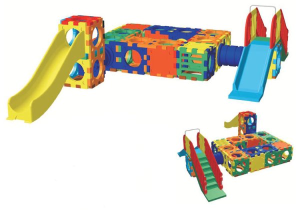 Tartalma: - 47 db 66x66x6 cm-es panel - 16 db dupla panel - 2 alagútpanel - 1 db csúszda - 1 db lépcső korláttal és csúszdával. Az elemen lévő lyuk átmérője 44 cm. 2 éves korú gyermekek használatára CE minősítéssel ellátva!