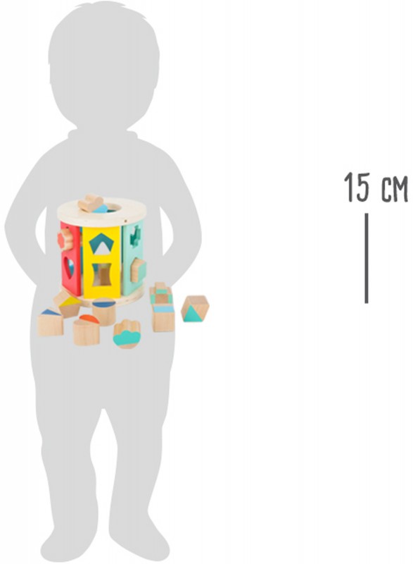 A fa formák különböző mintázattal vannak ellátva, és azokat a megfelelő alakzatba kell a kicsiknek beilleszteni. Fejleszti a motoros készségeket, és megismerteti a formákat a gyerekekkel. Ha a játékot az oldalára fordítjuk akkor zörgő hangot ad ki. A gumiszalag megakadályozza az építőkockák kiesését.