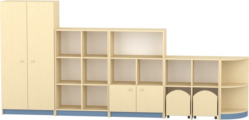 Szekrénysor A szekrénysor 5 részből áll: 1. elem: 3 polcos, teliajtós szekrény 2. elem: 6 fakkos tároló 3. elem: 4 fakkos, polcos, alulajtós tároló 4. elem: 4 fakkos, 2 fiókos, gurulós tároló 5. elem: 1 polcos sarokelem Formavilág: letisztult, jól tagolt kialakítás, egymáshoz illeszkedő modulokkal, játékos színkombinációkkal és átlátható tárolófelületekkel, amelyek segítik a rendszerezést és a gyermekek önálló használatát Felhasználás: bölcsődei és óvodai csoportszobákba ideális Szín: juhar-acélkék Készreszerelt termék. Térbeállítható: Nem Mérete: 360x40x88/128/168 cm