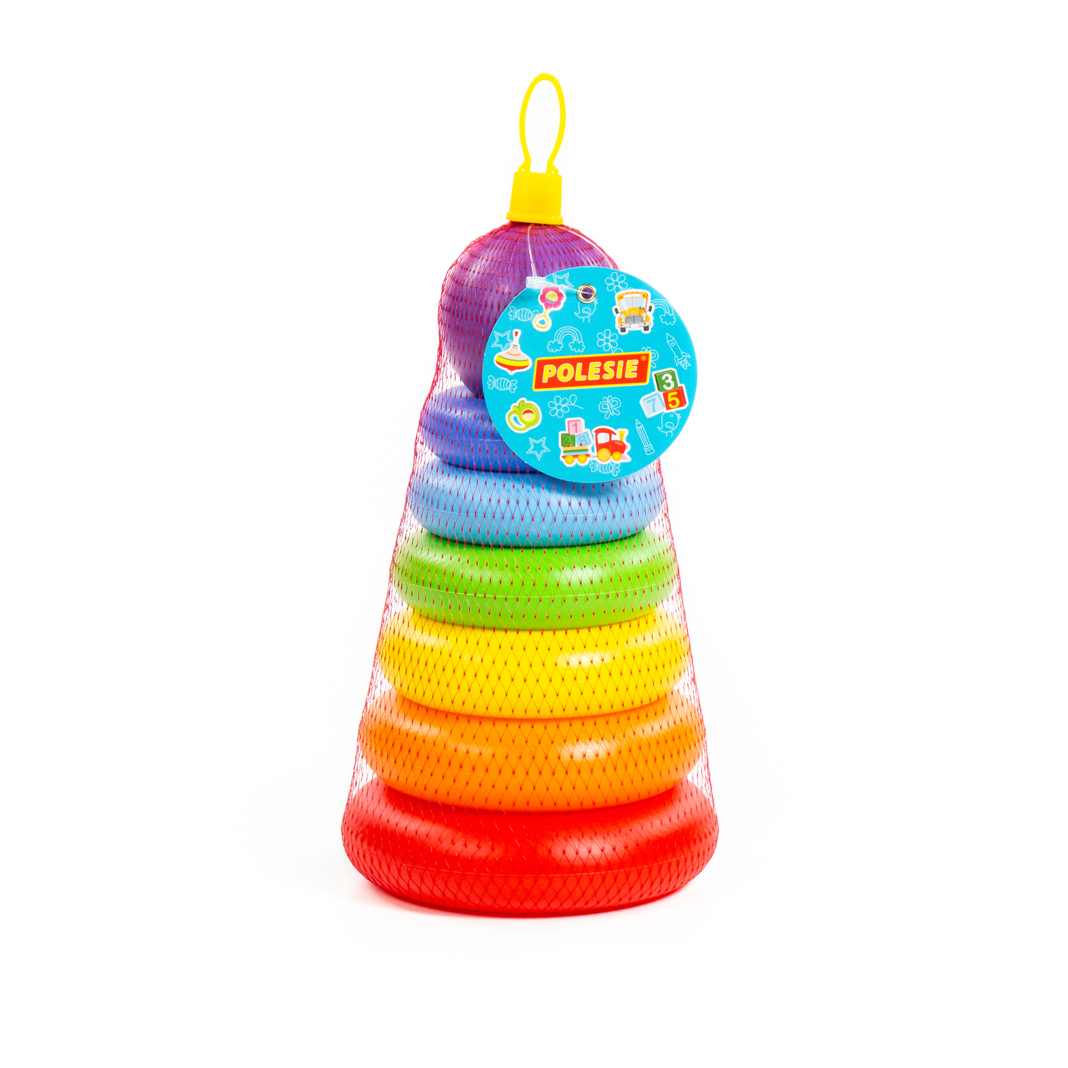 A színes piramis 6 különböző méretű és színű vastag gyűrűből, gyűrűállványból és 1 db gömbből áll, amelyeket a gyerekek egymásra rakhatnak. A játék célja, hogy ösztönözze a kicsiket a méret szerinti sorrend kialakítására, miközben szórakoztató és tanulságos élményt nyújt.