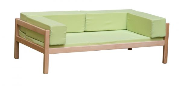 Gyermek kanapé. Tömör, lakkozott bükkfa keret, textillel bevont szivacs ülőke és párnák.