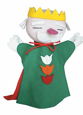 Öreg király kesztyűbáb felnőtt kézre Antoni Rozália iparművész által tervezett zsűrizett iparművészeti alkotás. Magyarországon előállított, többnyire magyar alapanyagokból, kézi munkával készített, magas minőségű termék, mely kimondottan pedagógia módszertani szempontok alapján lett kialakítva. Felnőtt kézre méretezve, így kiválóan alkalmas az anyanyelvi vagy zenés foglalkozások színesítésére, kiegészítésére. Az öreg király kesztyűbáb 25-30 cm nagyságú, három ujjas, puha textil anyagból készült báb. Teste zöld színű polár anyag, 3 színű filc tulipán díszítéssel. Királyos megjelenését lila polár palástja és citromsárga filc koronája erősíti. Feje rózsaszínű plüss anyag, kezei, bajsza, haja és szemöldöke fehér filc. Orra nagy méretű, sötétrózsaszín szín filc. Arckifejezése nyugodtságot tükröz. Megjelenése miatt könnyen beilleszthető bármilyen foglalkozásba. A manufakturális gyártásból adódóan előfordulhat, hogy a bábok más színű és mintájú anyagból készülnek el, mint ahogy az a képen látható!
