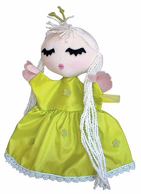 Magyarországon előállított, többnyire magyar alapanyagokból, kézi munkával készített, magas minőségű termék, mely kimondottan pedagógia módszertani szempontok alapján lett kialakítva. Felnőtt kézre méretezve, így kiválóan alkalmas az anyanyelvi vagy zenés foglalkozások színesítésére, kiegészítésére. A tündér kesztyűbáb 25-30 cm nagyságú, három ujjas, puha textil anyagból készült báb. Ruhája sárgás-zöld, kis virágos díszítéssel. Alsó része csipkével körbefuttatott. Hosszú fehér haja fonalból készült. Feje és kezei testszínűek. Arcán karakteres fekete szempillák, kisméretű rózsaszín száj és arcpír látható.