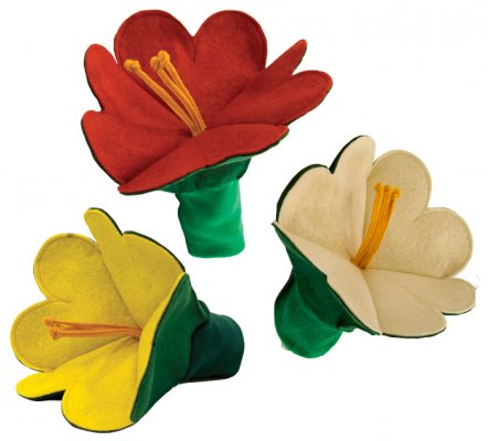 Virág kesztyűbáb felnőtt kézre. Antoni Rozália iparművész által tervezett zsűrizett iparművészeti alkotás. Magyarországon előállított, többnyire magyar alapanyagokból, kézi munkával készített, magas minőségű termék, mely kimondottan pedagógia módszertani szempontok alapján lett kialakítva. Felnőtt kézre méretezve, így kiválóan alkalmas az anyanyelvi vagy zenés foglalkozások színesítésére. A virág kesztyűbáb 25-30 cm nagyságú, puha textil anyagból készült báb. Különböző színekben, így piros, citromsárga és vajszínű verzióban érhető el. A bábok 4 db szív alakú sziromlevélből, hosszú porzókból és egy kis szárrészből állnak össze. Élénk és vidám színei, továbbá egyszerű, de mutatós kinézete miatt bármelyik tavaszi vagy tündérmese kitűnő kiegészítője lehet. A manufakturális gyártásból adódóan előfordulhat, hogy a bábok más színű és mintájú anyagból készülnek el, mint ahogy az a képen látható!