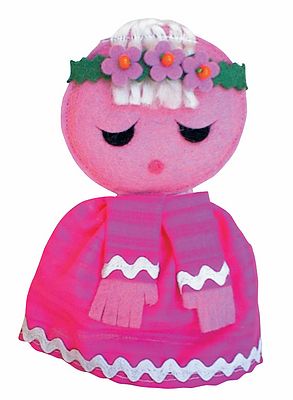 A kislány ujjbáb arca és kezei világosrózsaszínek, ruhája sötétrózsaszín. Haja fehér színű fonal, virágos hajpánt dísszel. Az ujjbábok mérete általánosságban kb. 12,5 cm. Antoni Rozália iparművész által tervezett zsűrizett iparművészeti alkotás. Magyarországon előállított, többnyire magyar alapanyagokból, kézi munkával készített, magas minőségű termék, mely kimondottan pedagógia módszertani szempontok alapján lett kialakítva. Kiválóan alkalmas az anyanyelvi vagy zenés foglalkozások színesítésére, kiegészítésére. A manufakturális gyártásból adódóan előfordulhat, hogy a bábok más színű és mintájú anyagból készülnek el, mint ahogy az a képen látható!