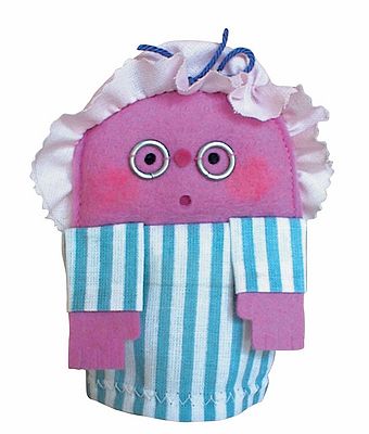 A nagymama ujjbáb arca és kezei rózsaszínek, ruhája kék csíkos, arcán pici szemüveggel. Kis fejkötője fehér színű. Az ujjbábok mérete általánosságban kb. 12,5 cm. Antoni Rozália iparművész által tervezett zsűrizett iparművészeti alkotás. Magyarországon előállított, többnyire magyar alapanyagokból, kézi munkával készített, magas minőségű termék, mely kimondottan pedagógia módszertani szempontok alapján lett kialakítva. Kiválóan alkalmas az anyanyelvi vagy zenés foglalkozások színesítésére, kiegészítésére. A manufakturális gyártásból adódóan előfordulhat, hogy a bábok más színű és mintájú anyagból készülnek el, mint ahogy az a képen látható!