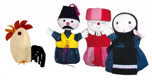 Bábkészlet felnőtt kézre, A kiskakas gyémánt félkrajcárja Tartalma: 4 db kesztyűbáb, kakas, török basa, szolgáló és gazdasszony. 4 éves kortól. A kesztyűbábok Antoni Rozália iparművész által tervezett zsűrizett iparművészeti alkotások. Magyarországon előállított, többnyire magyar alapanyagokból, kézi munkával készített, magas minőségű termékek, melyek kimondottan pedagógia módszertani szempontok alapján lettek kialakítva. A felnőtt kézre méretezett, 25-30 cm-es háromujjas kesztyűs kialakítás megkönnyíti a szerepjátékokat a felnőttek részére, de gyerekek is ugyanúgy tudják mindennapi, tartós játéknak is használni. Kakas: Teste világos krémszínű, farktollai feketék, taraja élénk piros. Hosszú csőre és lábai narancssárgák. Török basa: Felsőruházata piros, nadrág része pedig rózsaszín-piros csíkos. Fején lévő turbán a nadrággal megegyező mintájú. Kezei és feje fehér színűek. Arcán kis fehér szakál és rózsaszínes pír található. Tekintete kedves és mosolygós. Gazdasszony: Ruhája sötétkék alapon virágmintás. Köténye és kendője fekete színű. Arca és kezei fehérek, arckifejezése kedves, de nem tükröz erős érzelmeket. Szemei feketék, orra és szája világos színű. Arcát rózsaszínes pír díszíti. Szolgáló: Teste sötét alapon színes mintás, élénk sárga mellénnyel kiegészítve. Fején fekete színű kalapot visel, sötétrózsaszín díszítéssel. Kezei és arca fehérek. Szemei és bajsza feketék, orra és arcpírja rózsaszín. A manufakturális gyártásból adódóan előfordulhat, hogy a bábok más színű és mintájú anyagból készülnek el, mint ahogy az a képen látható!