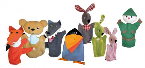 Bábkészlet felnőtt kézre, A három nyúl Tartalma: 8 db kesztyűbáb, 3 nyúl, varjú, róka, farkas, medve és vadász. 4 éves kortól. A kesztyűbábok Antoni Rozália iparművész által tervezett zsűrizett iparművészeti alkotások. Magyarországon előállított, többnyire magyar alapanyagokból, kézi munkával készített, magas minőségű termékek, melyek kimondottan pedagógia módszertani szempontok alapján lettek kialakítva. A felnőtt kézre méretezett, 25-30 cm-es háromujjas kesztyűs kialakítás megkönnyíti a szerepjátékokat a felnőttek részére, de gyerekek is ugyanúgy tudják mindennapi, tartós játéknak is használni. 3 nyúl: Testük és fejrészük színesek, mellkasuk mintás. Orruk és gombszerű nagy szemeik feketék. Arcuk barátságos megjelenésű, bajszuk és nagy füleiknek köszönhetően egyértelműen felimerhető karaktert mutatnak. Varjú: teste szürkés színű, nagyméretű karakteres csőre narancssárga, feje fekete. Lábai barnás árnyalatúak. Róka: Teste, fejrésze és farka élénk narancssárgák, mellkasa fehér. Hosszúkás fején fehér bajusz található. Szemei és orrahegye feketék, fülei hegyesek. Kialakításának köszönhetően egyértelműen felismerhető karaktert mutat. Farkas: Teste sötétszürke, fejrészének formája háromszögszerű. Nyitott szája belül rózsaszín, nyelve piros, nagy fehér fogai jól adják vissza a mesékben is megjelenő karaktert. Szemei zöldek, fekete pöttyel. orrahegye fekete, fülei hegyesek. Medve: Teste és fejrésze világosbarna, mellkasa fehér színű. Orra, szája és karmai feketék. Vadász: Teste középzöld, barna övvel és zsebekkel. Kalapja a testével megegyező színű. Feje fehér, arcán rózsaszínes orr, fekete szemek és fehér bajusz található. A manufakturális gyártásból adódóan előfordulhat, hogy a bábok más színű és mintájú anyagból készülnek el, mint ahogy az a képen látható!