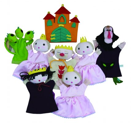 Bábkészlet felnőtt kézre, Királyos mesék Tartalma: 8 db kesztyűbáb, boszi, öreg király, királyfi, 3 királylány, sárkány és kastély. 4 éves kortól. A kesztyűbábok Antoni Rozália iparművész által tervezett zsűrizett iparművészeti alkotások. Magyarországon előállított, többnyire magyar alapanyagokból, kézi munkával készített, magas minőségű termékek, melyek kimondottan pedagógia módszertani szempontok alapján lettek kialakítva. A felnőtt kézre méretezett, 25-30 cm-es háromujjas kesztyűs kialakítás megkönnyíti a szerepjátékokat a felnőttek részére, de gyerekek is ugyanúgy tudják mindennapi, tartós játéknak is használni. Boszi: Csizmája sötétzöld, kendője fekete. Arca gyermekek számára is mókás, hosszú piros orral és kis méretű zöld szemekkel. Haja fehér színű fonalból készült. Kezei világoslilák. A mesékben megjelenő boszorkányos karakterleírásoknak megfelel, mégsem ad rémisztő összképet. Öreg király: Teste világos színű, tulipános díszítéssel. Királyos megjelenését sárga koronája erősíti. Feje és kezei fehérek. Orra nagy méretű, rózsaszín színű. Haja és nagy bajsza fehérek. Királyfi: Teste fekete, lila palásttal. Arca fehér színű, rózsaszínes pírral, ami még barátságosabbá teszi megjelenését. Haja fekete fonalból készült, fejét sárga korona díszíti. Szája kis méretű, arckifejezése kedves megjelenést kölcsönöz neki. 3 királylány: Ruhájuk világos rózsaszín. Kezeik és arcuk testszínű, rózsaszínes pír teszi bájos megjelenésűvé. Hajuk fehér színű fonalból készült. Szemeik feketék, orruk és szájuk rózsaszín. Fejükön kis korona található. Sárkány: Teste, farka és mindhárom feje élénk zöld színű. A fejeken kis taréj, sárga orrok és nagy fekete szemek vannak. Kastély: A kapu és az ablakok zöld színűek, sárga zsanér díszítéssel. A falak vöröses árnyalatúak, piros színű tetővel. Három tornya közül a középső kiemelkedik. Királyi palota jellegét a kapu felett lévő sárga korona dísz is erősíti. A manufakturális gyártásból adódóan előfordulhat, hogy a bábok más színű és mintájú anyagból készülnek el, mint ahogy az a képen látható!