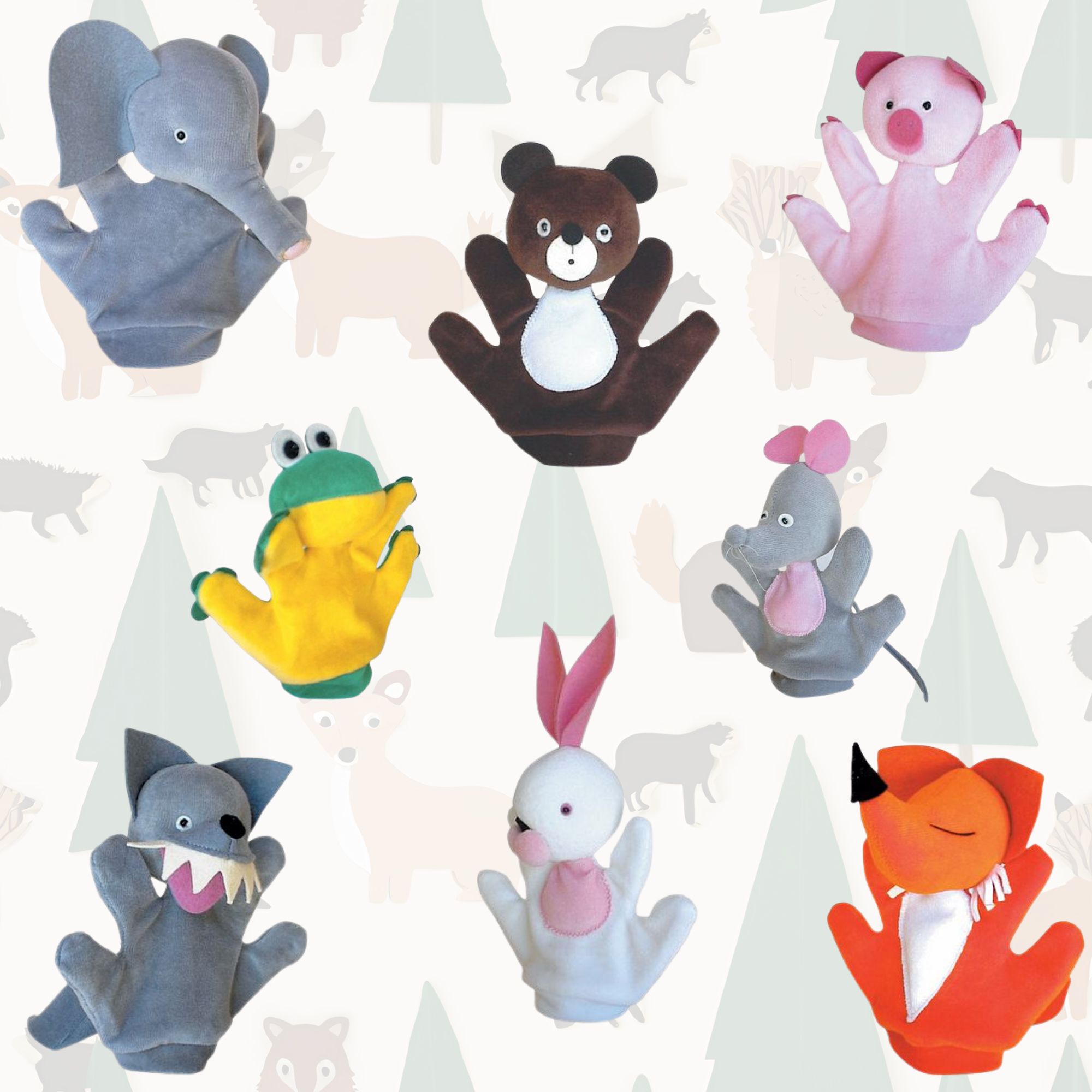 8 db kesztyűbáb gyermek kézre Béka, Egér, Elefánt, Farkas, Mackó, Malac, Nyúl, Róka