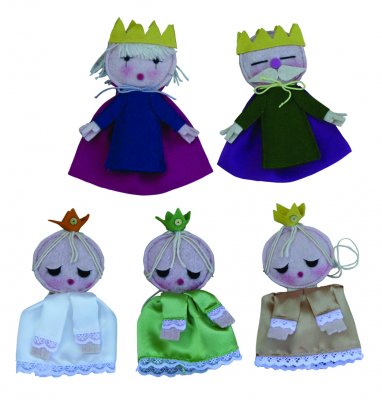 A só ujjbábkészlet tartalma 5 db ujjbáb: három királylány, öreg király és királyfi. Az ujjbábok mérete általánosságban kb. 12,5 cm. Antoni Rozália iparművész által tervezett zsűrizett iparművészeti alkotás. Magyarországon előállított, többnyire magyar alapanyagokból, kézi munkával készített, magas minőségű termék, mely kimondottan pedagógia módszertani szempontok alapján lett kialakítva. Kiválóan alkalmas az anyanyelvi vagy zenés foglalkozások színesítésére, kiegészítésére. A manufakturális gyártásból adódóan előfordulhat, hogy a bábok más színű és mintájú anyagból készülnek el, mint ahogy az a képen látható!
