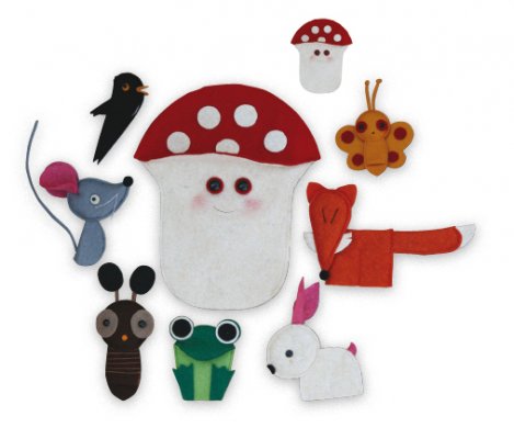 A gomba alatt ujjbábkészlet tartalma 6 db ujjbáb: pillangó, egér, nyuszi, madárka, róka és béka, illetve 1 db kesztyűbáb gyermek kézre: gomba. Az ujjbábok mérete általánosságban kb. 12,5 cm. Antoni Rozália iparművész által tervezett zsűrizett iparművészeti alkotás. Magyarországon előállított, többnyire magyar alapanyagokból, kézi munkával készített, magas minőségű termék, mely kimondottan pedagógia módszertani szempontok alapján lett kialakítva. Kiválóan alkalmas az anyanyelvi vagy zenés foglalkozások színesítésére, kiegészítésére. A manufakturális gyártásból adódóan előfordulhat, hogy a bábok más színű és mintájú anyagból készülnek el, mint ahogy az a képen látható!